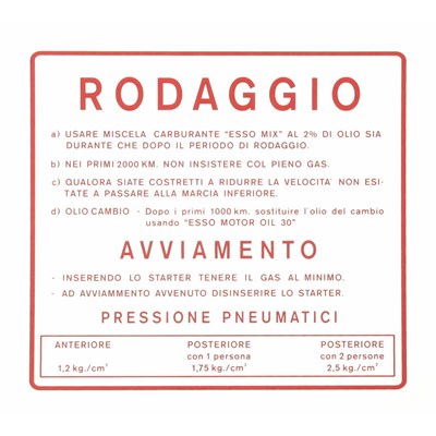 Aufkleber Einfahrvorschrift, RODAGGIO für Vespa 180-200 Rally