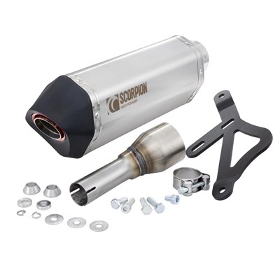 Mit den RED POWER Auspuffanlagen ist der Name Programm! Die moderne Form der SCORPION Red Power Auspuffanlagen ist zwar keine Neuerung auf dem Markt, allerdings bekommt man hier einen hochwertigen Rennauspuff aus Edelstahl. Was sind die Vorteile der Scorpion Red Power Rennauspuffanlage?Hochwertige Verarbeitung Reduziertes GewichtErhältlich in Edelstahl gebürstet oder schwarz keramikbeschichtetDer hexagonale Endschalldämpfer ist in Edelstahl gebürstet oder mit schwarzer Keramikbeschichtung verfügbar. Beide Varianten werden mit schwarzer Endkappe, durch den roten Zierring um den DB-Killer bekommt der Auspuff einen zusätzlichen sportlichen Hauch und ist charakteristisch für den Namen RED POWER! Ihren Namen verdient sich die Anlage zurecht, denn neben der deutlichen Gewichtsersparnis von angeblich 3,4 Kg. gegenüber dem Originalauspuff wird laut Herstellerangaben auch eine minimale Leistungssteigerung mit eingebautem DB-Killer möglich. Das Edelstahlverbindungsrohr wird mittels Federn mit dem Dämpfer verbunden. So werden die Vibrationen einfach weggesteckt, ein Reißen des Dämpfers oder des Krümmers wird nahezu unmöglich. Im Lieferumfang sind neben dem Endschalldämpfer und Verbindungsrohr auch sämtliche benötigten Montagematerialien enthalten. Fazit: Schöner hochwertiger Rennauspuff, leider ohne Zulassung.Das beste Setup unser SIP-TIPP:Für eine bessere Leistungsentfaltung empfehlen wir den Einsatz von sportlichen Komponenten im Antriebsstrang (z. B. MALOSSI Multivar Variator + MALOSSI Delta Clutch Kupplung + POLINI Speed Bell Evo Kupplungsglocke)Wer mehr will, kommt um das MALOSSI Forcemaster 3 Einspritzmodul (Art.-Nr. M5518480) nicht rum