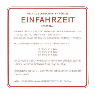 Bei allen alten Vespamodellen findet sich auf der Rahmeninnenseite eine Einfahrvorschrift. Diese gibt an, wie der Roller damals im Neuzustand gefahren werden sollte. Mischungsverhältnis, Reifendruck, maximale Einfahrgeschwindigkeiten in den einzelnen Gängen, etc. wird hier angegeben. Einige dieser Aufkleber gibt es auch als Wasserabziehbild. Hier wird der Aufkleber, exakt wie damals, auf den Lack aufgebracht. Eine Anleitung dazu findet sich im Downloadbereich. Andere Aufkleber sind wie heutzutage gewohnt auf eine transparente Klebefolie gedruckt. Fazit: Ein nettes I-Tüpfelchen, nicht nur für Oldies.