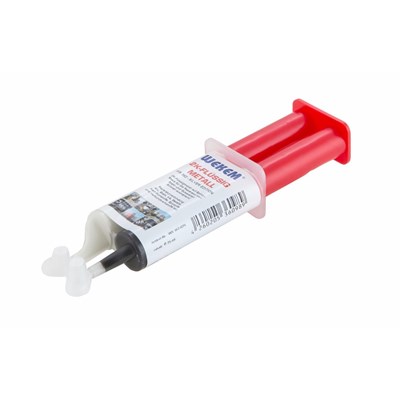 2K-Flüssigmetall auf Epoxy-Basis für die Reparatur von Stahl und Gusstellen, füllt Risse, Löcher und Lunkerstellen, schnell aushärtend Reparaturverbindungen: Alu, Stahl, VA, Metalle, Hart-Kunststoffe, Epoxyde und Verbundwerkstoffe Verarbeitungshinweise:die zu verarbeitende Oberfläche muss sauber und fettfrei seinSpitzen der Doppelspritze abschneiden, jeweils Menge ausdrücken und mischen, bis gleichmäßige Farbe erziel wird. Danach auftragenNach Gebrauch beide Spitzen mit der mitgelieferten Kappe verschließenNach ca. 20 Minuten kann eine mechanische Bearbeitung der reparierten Stelle erfolgen