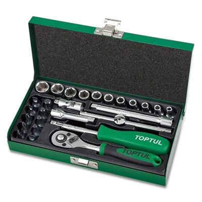 Steckschlüsselsatz in qualitativ hochwertiger Ausführung. Der Steckschlüsselsatz von TOPTUL sollte in keiner Werkstatt fehlen. Durch seine hohe Fertigungsqualität ist er auch für den anspruchsvollen täglichen Gebrauch geeignet.Hohe FertigungsgüteGroße Auswahl an verschieden Nüssen und BitnüssenStabile Verpackungsbox Der Steckschlüsselsatz wird in einer matten Chrom Ausführung geliefert. Durch seine geringe Größe ist er perfekt für daheim oder die große Vespa Tour. Die geringe Größe bedeutet aber nicht, dass die Ausstattung etwas vermissen lässt. Im Gegenteil, es ist alles dabei, was man zum Schrauben braucht. Highlights im Überblick:Matte Chrom AusführungExtra stabile BitnüsseStabile Verpackungsbox aus MetallRatsche mit 36 Zähnen und Schnellentriegelung Fazit: Ein Steckschlüsselsatz mit einer umfangreichen Ausstattung zu einem sehr guten Preis/Leistungsverhältnis. Kaufempfehlung unser SIP TIPP:Direkt mit weiterem Werkzeug von TOPTUL kombinieren.Eine Werkzeugtasche für die Aufbewahrung wäre eine gute Ergänzung. Inhalt:1/4“ Stecknüsse: 4, 5, 5.5, 6, 7, 8, 9, 10, 11, 12, 13 mm 1/4“ Verlängerung: kurz (2“Länge) und lang (4“Länge) 1/4“ Gelenkstück 1/4“ Verschiebbarer T-Griff 1/4“ Kombihandgriff 1/4“ Ratsche, verstellbar und mit 36 Zähnen 1/4“ Kreuzschlitz Stecknuss (PH1, PH2 und PH3) 1/4“ Schlitz Stecknuss (4.5, 6.5, 8 mm) 1/4“ Innensechskant Stecknuss (4, 5, 6, 8 mm)