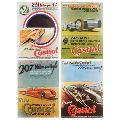 Meilensteine und Rekorde der Geschichte wurden auf 4 DIN A3 Postern von CASTROL CLASSIC festgehalten. Diese Poster werten jeden Verkaufsraum, jede Werkstatt und jedes Wohnzimmer optisch auf. Die Marke CASTROL steht seit jeher für bahnbrechende Erfolge, Leidenschaft und Leistung. Diese Postermotive sind im Set enthalten:Daytona Beach, 29.03.1927 - Major H.O.D. Segrave , Rennwagen "Sunbeam", Weltrekord für 1 km, 5 km und 1 Meile im Bereich Geschwindigkeit. Es wurde eine Spitzengeschwindigkeit von bis zu 203,79 mph (327,97 km/h).Daytona Beach, 19.02.1928 - Capt. Malcolm Campbell, Rennwagen "Blue-Bird", Weltrekord auf 1 Meile, Höchstgeschwindigkeit 206,95 mph (333,05 km/h).Daytona Beach, 11.03.1929 - Major Sir Henry Segrave, Rennwagen Irvin-Napier "Golden-Arrow", Weltrekord für Geschwindigkeit auf einer Meile mit 231,36 mph (372,34 km/h)Daytona Beach, Februar 1931 - Capt. Malcolm Campbell, Geschwindigkeitsweltrekord für den fliegenden Kilometer mit 245 mph (394,29 km/h). Erstmals wurde in einer Minute mehr als vier Meilen mit einem Landfahrzeug zurückgelegt. Für diesen fünften Record von Capt. Campbell erhält er die Erhebung in den Adelsstand durch König Gregory V bei einem feierlichen Empfang in London. Der Rennwagen, der mit einem 2500 PS starken Motor ausgerüstet war, wurde von der Presse als "Überwagen" gefeiert. Er stellte diesen am 12.01.1933 in Berlin vor. Einige Weltrekorde wurden mit CASTROL Produkten aufgestellt. Das Unternehmen hat spektakuläre Meisterleistungen, erste Pioniere und Rekorde an Land, zu Wasser und in der Luft unterstützt.