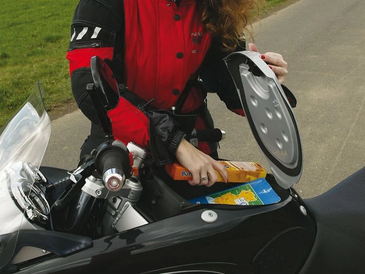 Dort, wo sich normalerweise der Tank befindet, hat die F 650 CS eine große Ausbuchtung. Wir haben die gute Idee aufgegriffen und eine hochwertige sowie abschließbare Abdeckung gefertigt, die alles Wichtige in der Ausbuchtung schützt und die