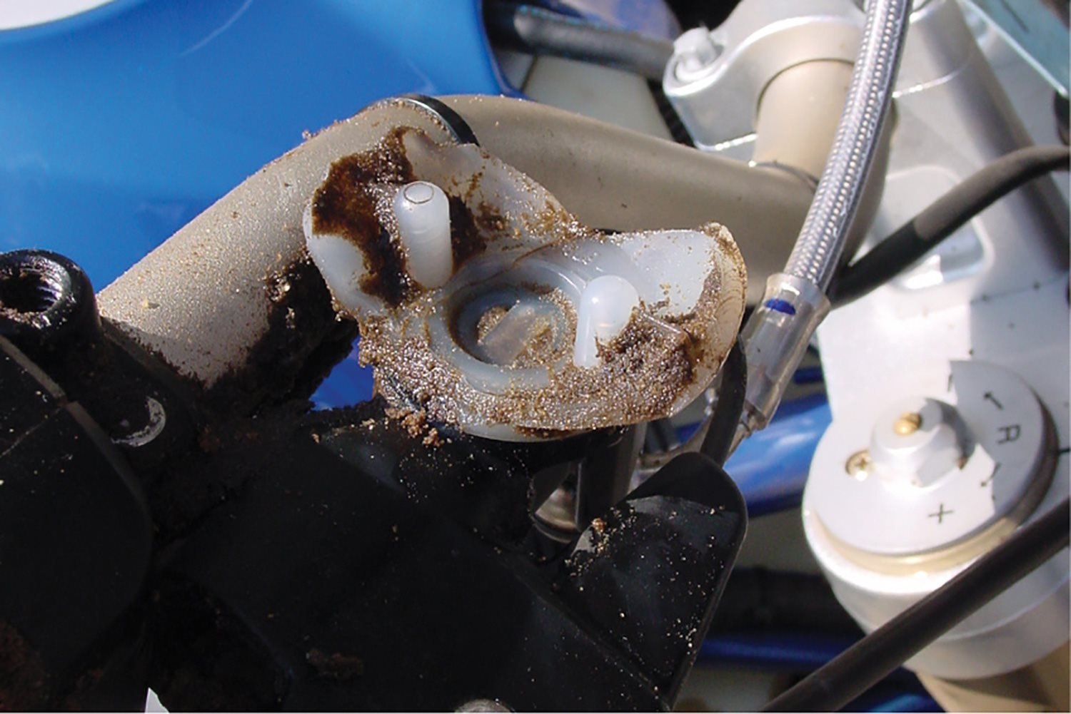 Die Hydraulikbehäter sind dermassen exponiert und empfindlich, dass schon einfache Umfaller zum Aus führen.Eine teure Reparatur und nicht selten der Urlaubsabbruch sind die Folge. Drei kaputte Bremsbehälter später haben wir diesen Schutz entwickelt, der sich über eine konstruktiv komplexe Halterung direkt an der Lenkerverschraubung abstützt und noch zusätzlich am Protektorenhalter -(Protektoren müssen nicht montiert sein) befestigt wird. Deshalb machte es Sinn, dickwandiges Aluminium zu -verwenden, das Schläge an die ausgeklügelten Halter weitergeben kann, ohne selbst zerstört zu werden.