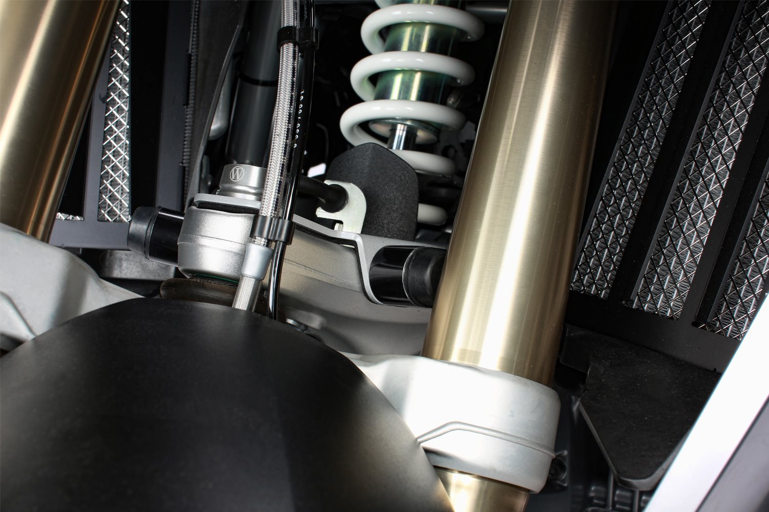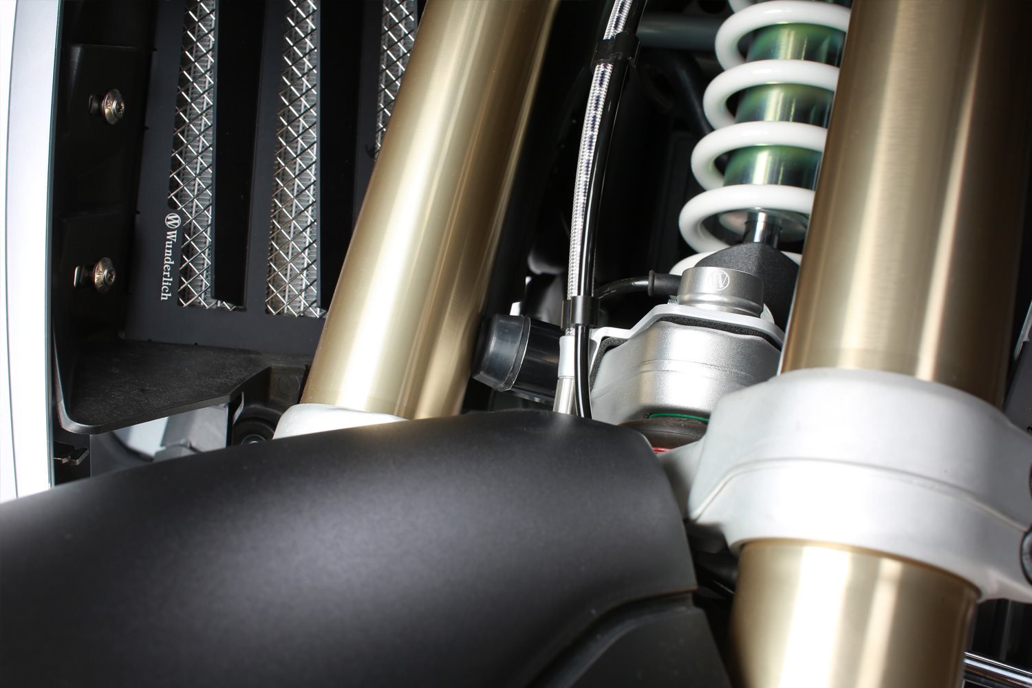 Wunderlich Lenkanschlag-Begrenzung Die Original Lenkanschlag-Begrenzungen sind schlicht zu schwach dimensioniert. Schon beim harmlosen Umfallen oder einem heftigen Einschlag kann das Original beschädigt werden. Die Gabelbrücke kann dabei zerstört werden, was eine teure Reparatur nach sich zieht. Zudem können dabei Gleitrohre, Lenkungsdämpfer und Telelever ebenfalls Schaden nehmen. Da diese Teile leider nicht als Sonderangebot erhältlich sind, lohnt sich diese Ausgabe allemal. Ein äußerst stabiler Zentralhalter samt robusten Anschlaggummis schnell an der unteren Gabelbrücke angebracht. Eine sehr effektive, leichte und unzerstörbare Gesamtkonstruktion: Der Lenkeinschlag wird in den ersten Millimetern weich begrenzt und mit zunehmender Kompression immer härter. Das Einschlagen des Lenkers ist wesentlich angenehmer, da die harte Original-Beschreibung zu Wunderlich Lenkanschlag-Begrenzer- silber anzeigen