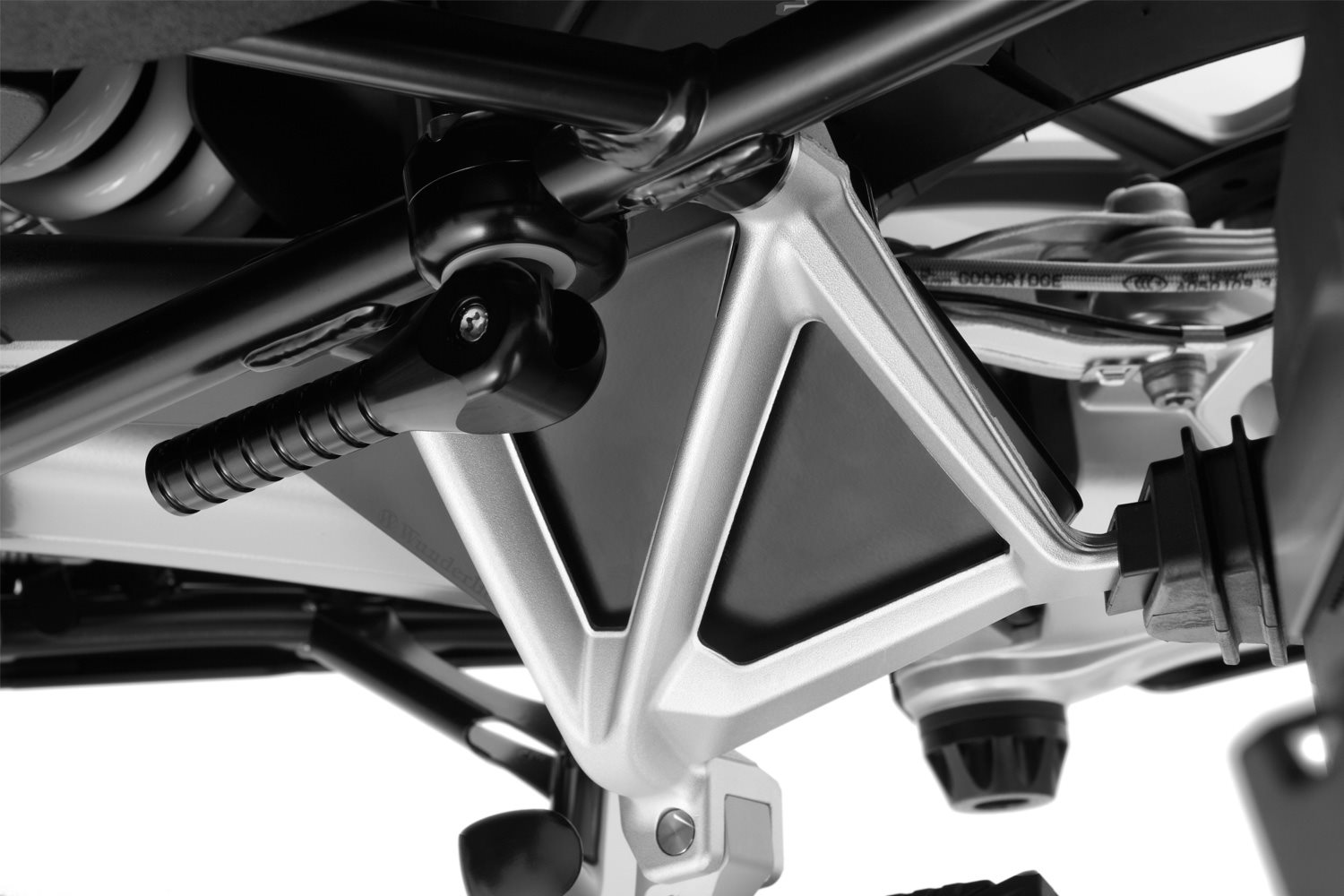Die beiden Sozius-Spritzschutzprotektoren für die rechte und die linke Seite sind maßgeschneidert. Sie verschließen die beiden seitlichen Öffnungen des Rahmenhecks im Bereich der Beifahrerfußrasten passgenau. Vom Hinterrad aufgewirbelter Schmutz, Steinschlag, Spritzwasser oder Gischt werden effektiv aufgefangen bzw. innerseitig abgeleitet, bevor sie den Beifahrer erreichen. Gleichzeitig wird die Verschmutzung der Maschine spürbar reduziert. Das durch die Aussparung dynamische Design bleibt dezent und wirkt am Motorrad unaufdringlich und stimmig.