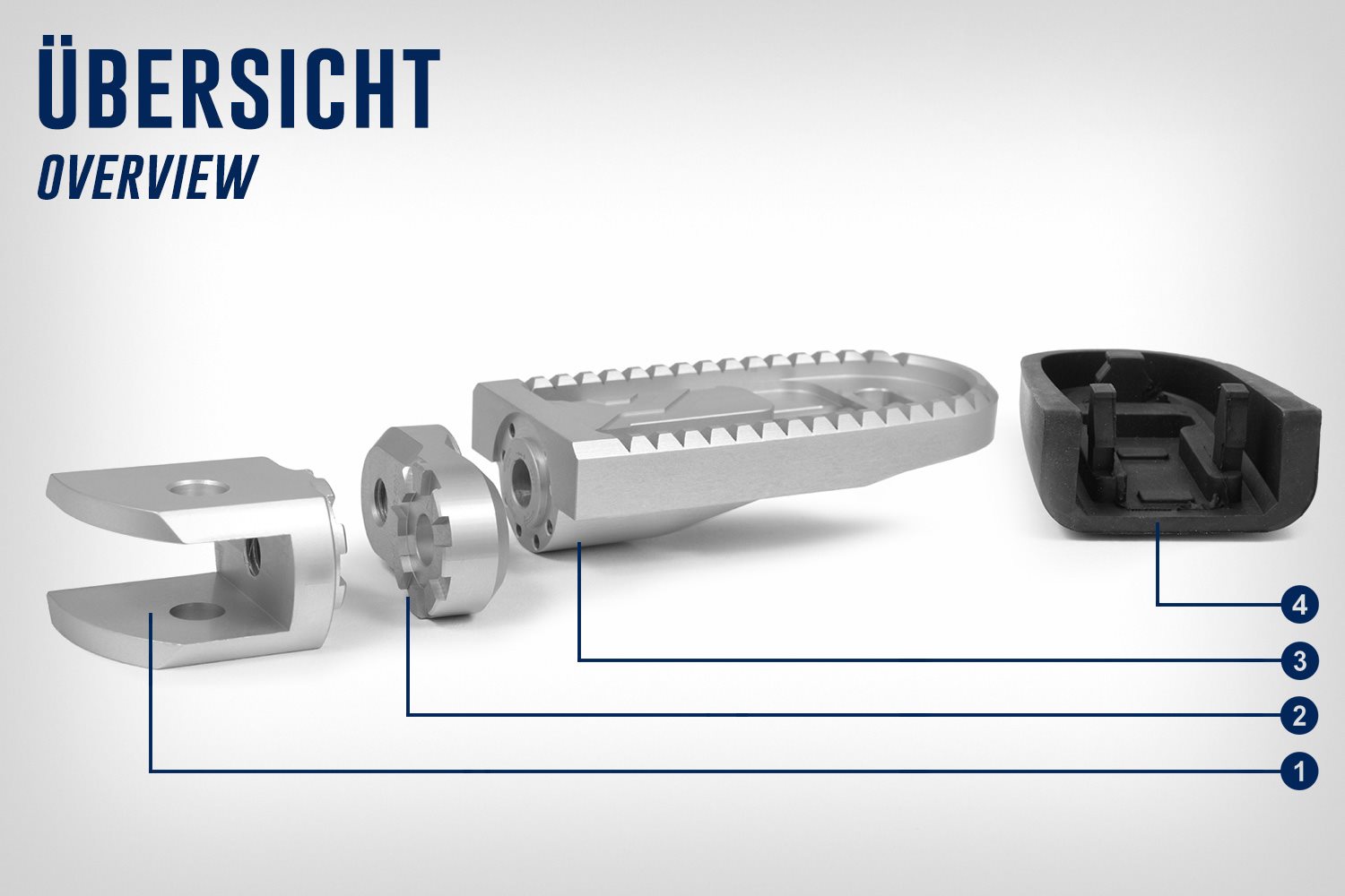 Die Basis des Systems ist das für das jeweilige Fahrzeugmodell passende, silberfarbene oder schwarze Variogelenk, welches anstelle der Fußraste an der Fußrasten-Halterung montiert wird.