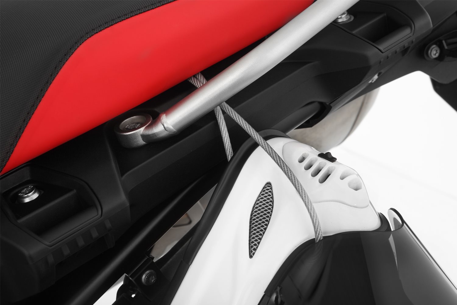 Die transparente, großzügig dimensionierte Ummantelung des Sicherungsseils aus Silikon schont Helme wie Motorrad vor Scheuerstellen und Lackschäden. Das Seil wird bei Nichtgebrauch -stets griffbereit- platzsparend unter der Sitzbank verstaut.