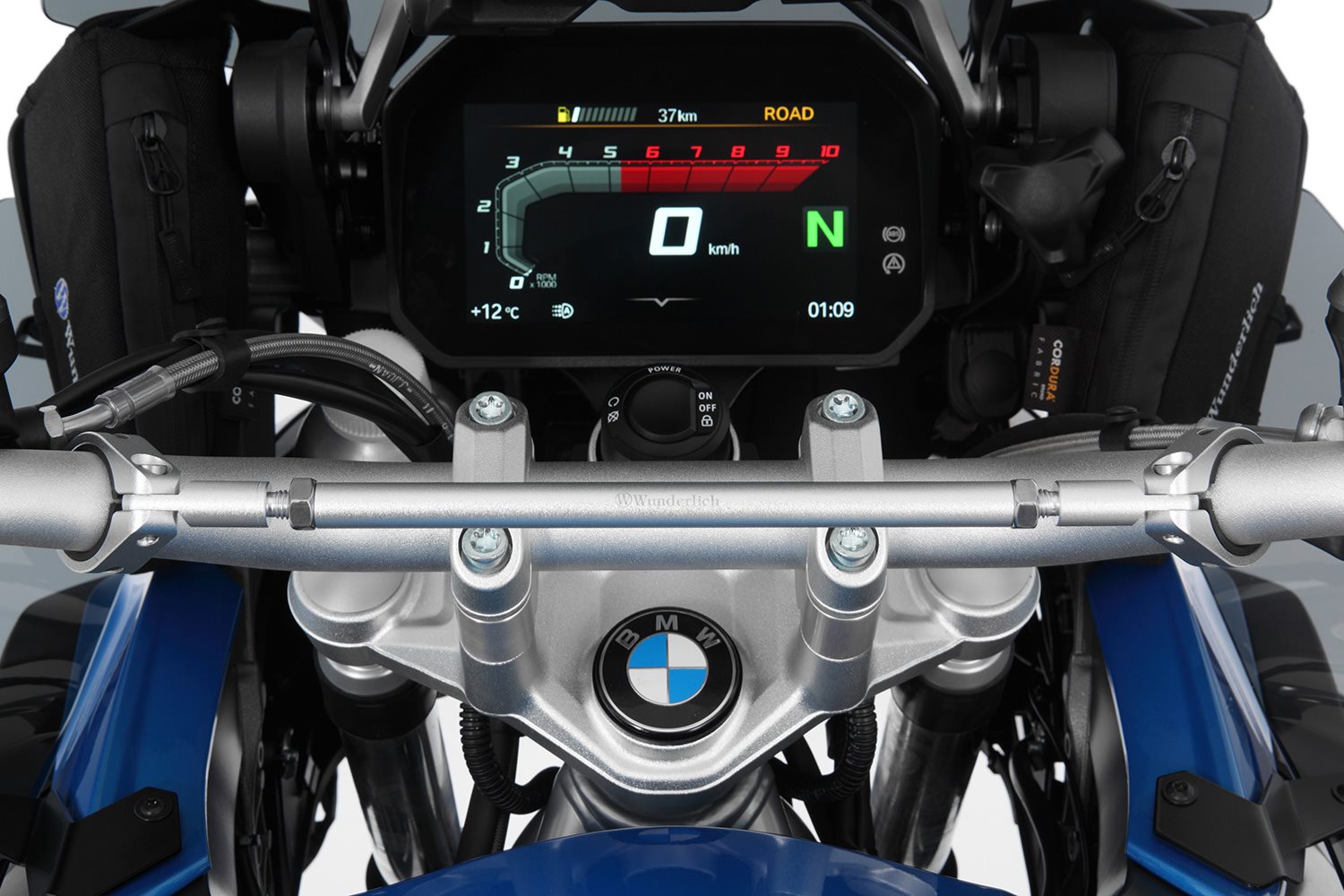 Die hochwertige silberne Lenkermittelstrebe aus Aluminium ist 250 mm lang hat einen Durchmesser von 12 Millimetern, die Oberfläche ist glasperlengestrahlt. Die Breite kann individuell an verschiedene Lenkerformen und -durchmesser angepasst werden. Die Aufnahmen sind auch für konifizierte Lenker geeignet. Neben der Betonung des Offroad-Erscheinungsbilds, dient sie also auch als perfekte Basis zum Anbringen von Zubehör. Die Befestigung der Mittelstrebe am Lenker erfolgt dazu mit elastischen Reduzierhülsen, so dass eine Entkopplung von Strebe und Lenker sichergestellt ist. Damit können insbesondere auch elektronische Geräte vibrationsgedämpft befestigt werden.