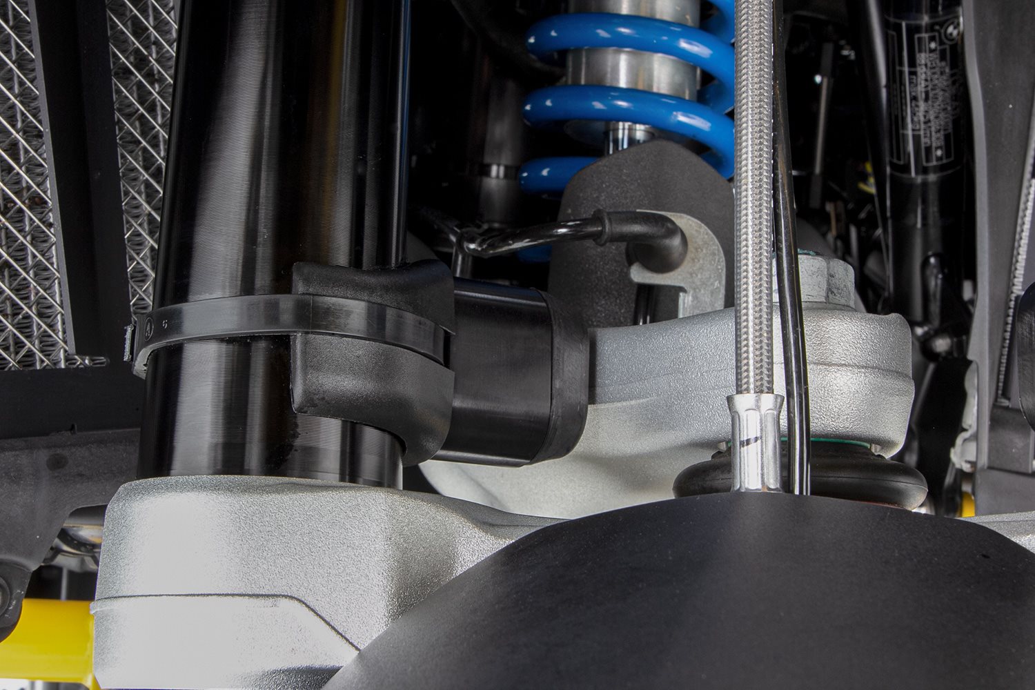 Das Montieren der beiden Lenkanschlag Begrenzer ist denkbar einfach: Sie werden zunächst mit einem verdeckt angebrachten, hochwertigen 3M Klebeband an den Gabelholmen befestigt und zusätzlich mit einem robusten Kabelbinder, der sich in unauffällig in die dafür vorgesehene, umlaufende Nut einfügt, angebracht.