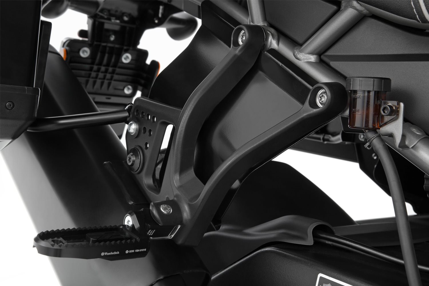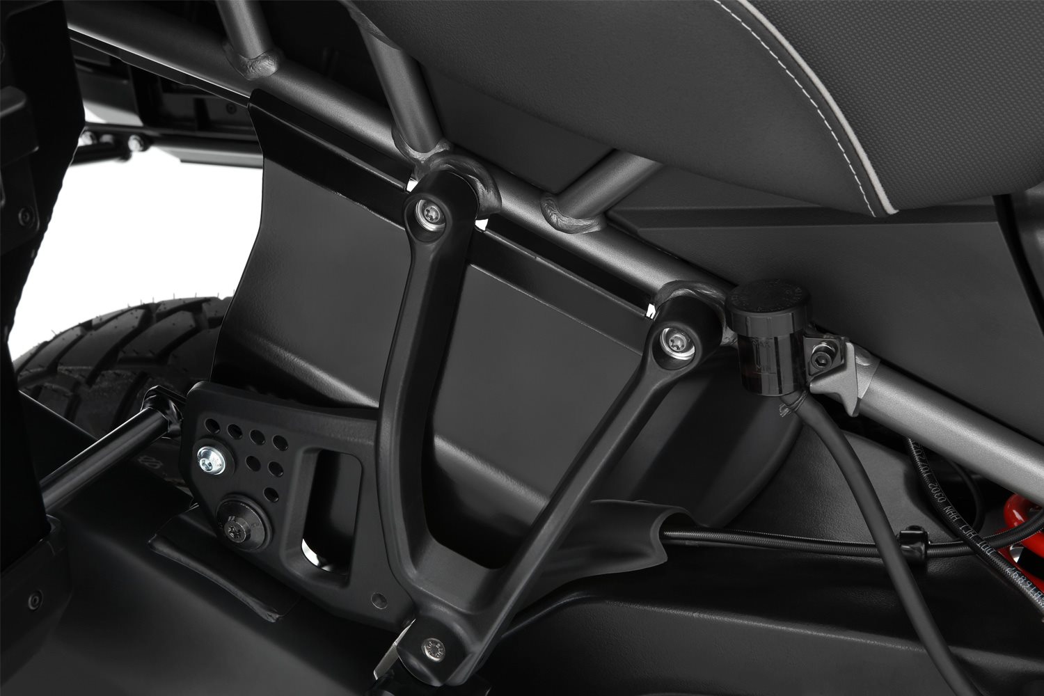 Unser Spritzschutz schließt die seitlichen Öffnungen der Soziusrastenträger und wird an vorhandenen Befestigungspunkten montiert. Er fängt die Gischt zuverlässig auf und leitet sie nach unten ab. So werden die unangenehmen Beeinträchtigungen durch Schmutz und Nässe effizient reduziert und der Komfort spürbar verbessert. Das Design des funktionalen Protektors integriert sich dezent und stimmig in die Flyline der Maschine.