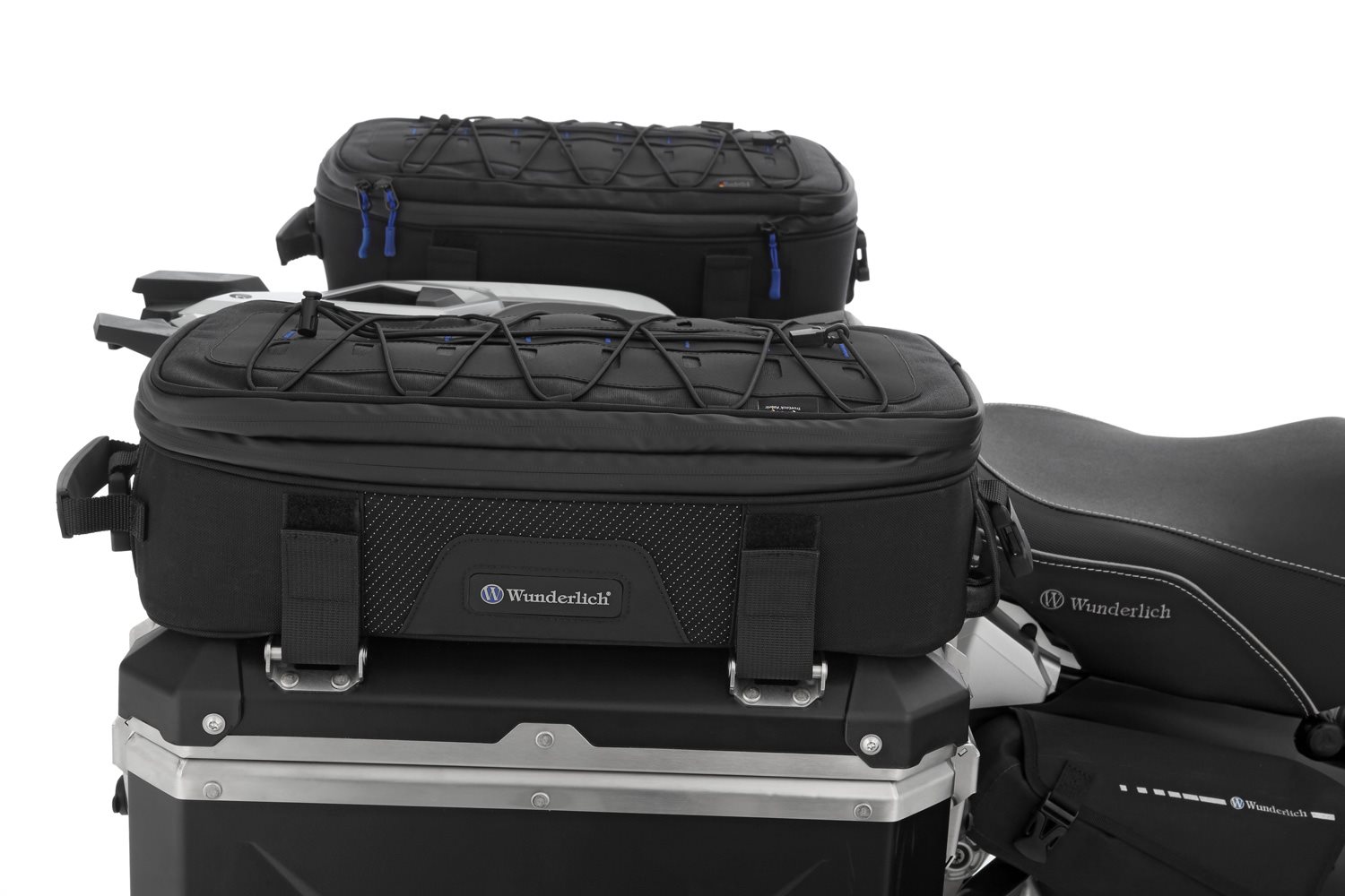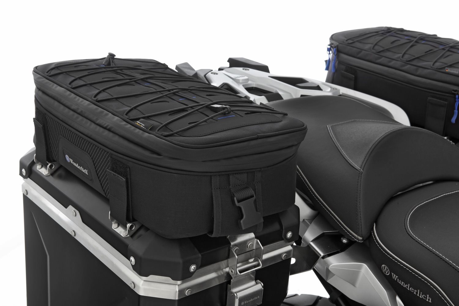 Die Basis der Toptasche ist mit einem umlaufenden formstabilen Einsatz ausgestattet. Daher gibt sie dem Gepäck sicheren Halt und Schutz und sie flattern auch bei hohen Geschwindigkeiten nicht. Sie verursachen deshalb auch keine geschwindigkeitsbedingten Flattergeräusche. Darüber hinaus bieten sie sich als sehr bequeme Armstütze für den Beifahrer an. Das Wunderlich typische blaue Innenfutter, bildet einen kontrastreichen Hintergrund, vor dem man auch kleine Reiseutensilien gut erkennt. Der Reißverschluss ist wasserabweisend ausgeführt und mit ergonomisch geformten, griffgünstigen, auch mit Handschuhen gut bedienbaren, blauen Zippern versehen.