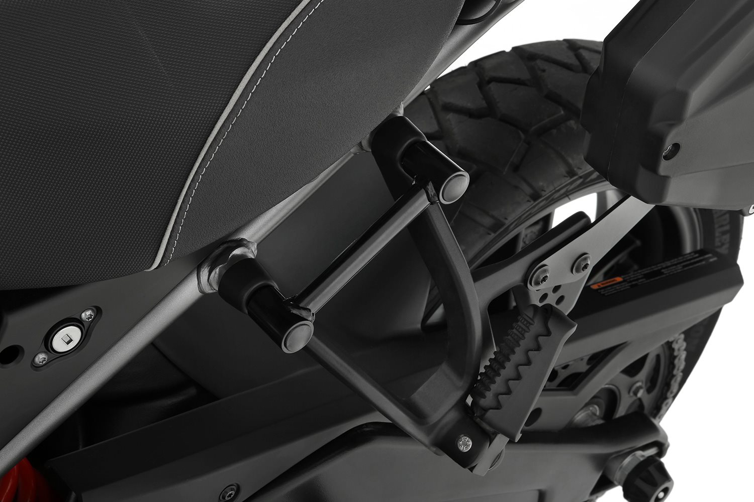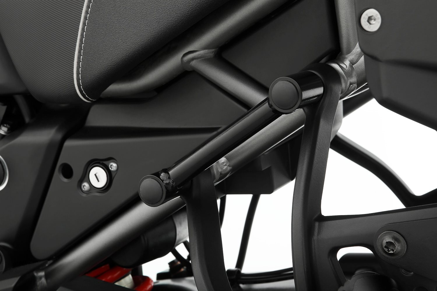 Bei diesem Griff handelt es sich um ein sehr, sehr hilfreiches und ergonomisches Bauteil, denn leider bietet die Pan America keine geeignete Möglichkeit, um sie kräftesparend und sicher auf den Hauptständer aufzubocken. Unser Aufbockgriff wird gut zugänglich auf der linken Seite, an zwei Anschraubpunkten an der Soziusrastenaufnahme, montiert. So lässt sich die Maschine spürbar leichter und vor allem sicherer auf den Hauptständer aufstellen. Dies liegt daran, dass der Griff gut in der Hand liegt und man damit deutlich mehr Kraft übertragen kann, als an den Rahmenrohren, die schlecht zu greifen oder durchs Gepäck gar nicht zugänglich sind. Wir fertigen unseren Aufbockgriff sehr hochwertig aus Stahl, das Design ist dezent und funktional.