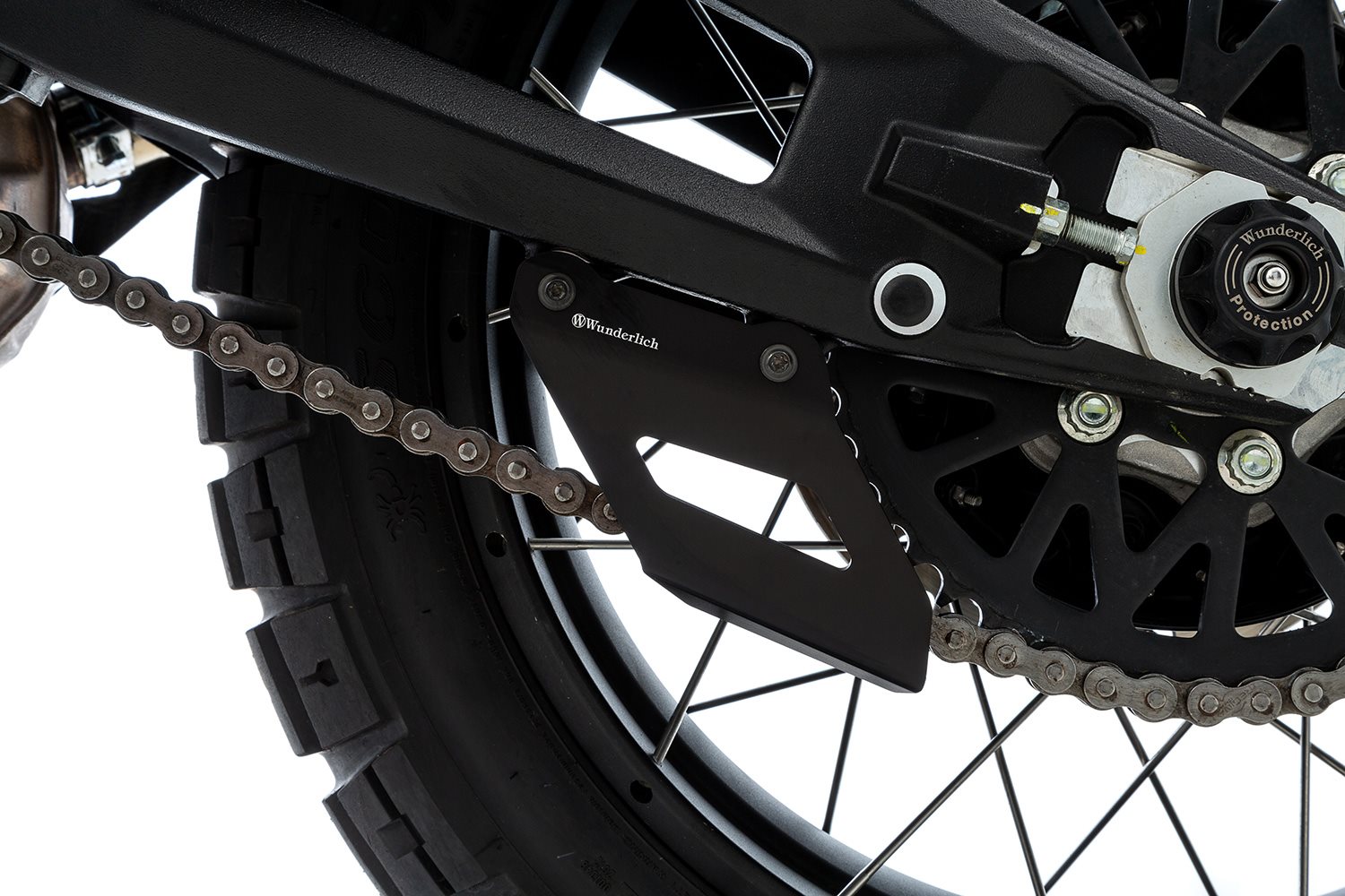 Werksseitig verfügt die DesertX über einen seitlichen Kettenschutz aus Kunststoff. Der soll im Gelände verhindern, dass sich Astwerk oder sonstige Fremdkörper unbeabsichtigt zwischen dem unteren Kettentrum und dem Kettenrad einfädeln. Diese Maßnahme reduziert die Gefahr, die durch das abrupte Blockieren des Hinterrads besteht und sie schützt vor mechanischen Schäden durch eine gerissene oder abgesprungene Kette. Es ergibt also grundsätzlich Sinn, hier einen entsprechenden Kettenschutz vorzusehen. Wir finden jedoch, dass er insgesamt widerstandsfähiger ausgeführt und auch die Unterseite der Kette umfassen sollte. Unser Kettenschutz erfüllt deshalb eine weitere wichtige Funktion: Beim Aufsetzen auf den unteren Teils des Kettenrums -durchaus nicht ungewöhnlich bei Fahrten in felsigem Gelände - schützt unser Kettenschutz auch das Kettenrad, das beim Aufsetzen auf Fels oder Geröll beschädigt werden kann. Deshalb haben wir eine langlebige, ausgesprochen robuste Version geschaffen, die wir aus solidem, vier Millimeter starkem Aluminium anfertigen, und die die Kette auch von unten umschließt. Die angebrachten Kantungen sorgen für zusätzliche Bauteilsteifigkeit. Trotz seiner Stabilität wirkt der Kettenschutz ausgesprochen dynamisch und integriert, denn dafür sorgt unser Design im Adventure Look. Mit Wunderlich Markenlogo. Für die einfache Befestigung nutzen wir die originalen Anschraubpunkte. Fakten Funktion Technische Daten Ihre Wunderlich VorteileBeschreibung zu Wunderlich Kettenschutz unten - schwarz anzeigen