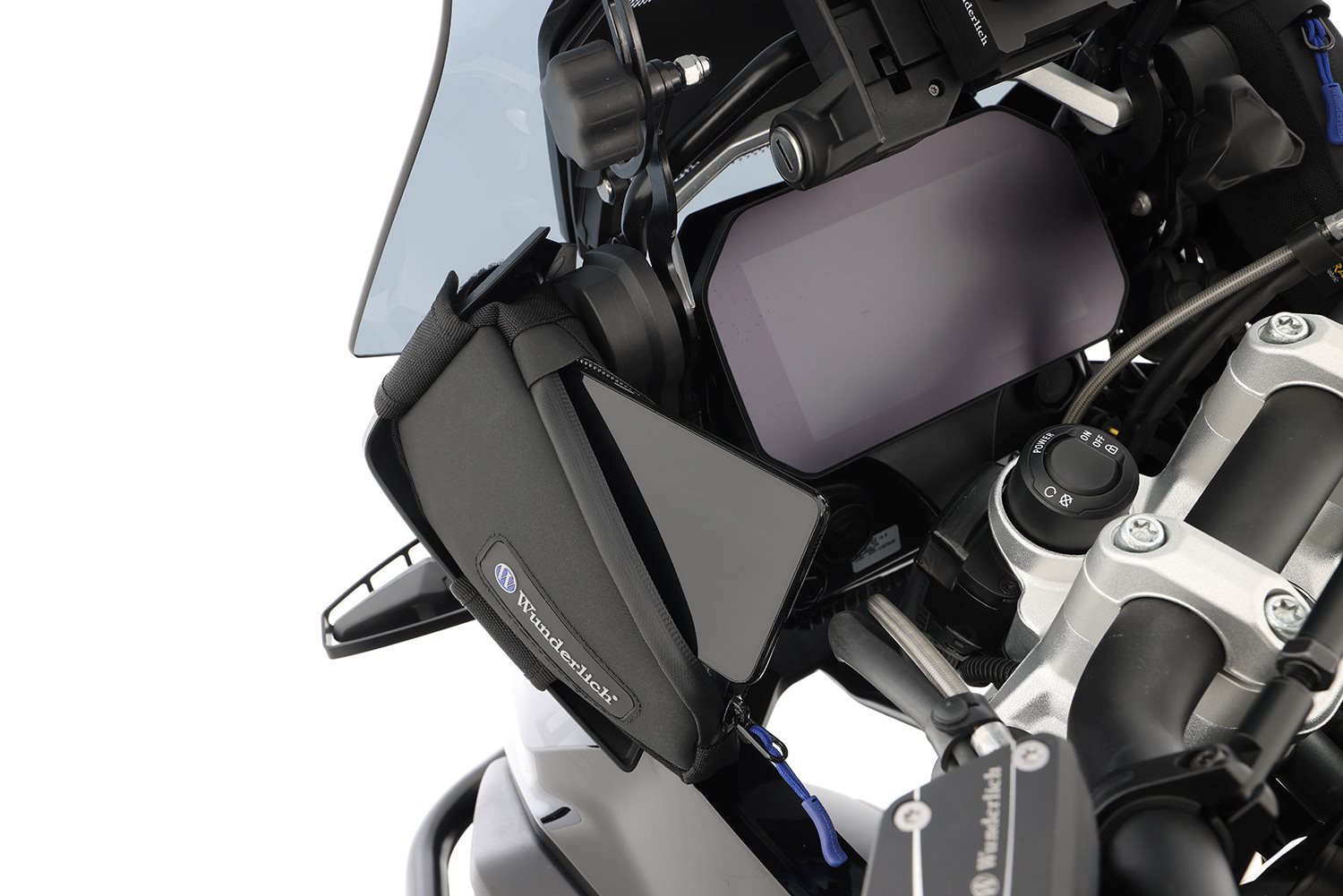 Die funktionellen Taschen dieses Sets haben wir für die verkleidungsergänzenden Windabweiser formschlüssig maßgeschneidert, so dass der durch die Windabweiser gebildete Raum clever genutzt werden kann. Auch bei diesen Taschen haben wir auf die gute Zugänglichkeit unterwegs größten Wert gelegt, sodass Sie aus dem Sattel heraus jederzeit einfach auf den bestens geschützten Inhalt zugreifen können. So finden die Fahrzeugpapiere und das Portemonnaie einen festen Platz. Wir haben das klare Design für größere Smartphones, wie beispielsweise das iPhone 14 Pro, optimiert. Damit Smartphones etc. unterwegs ladbar sind, verfügt die linke der beiden Taschen über einen E-Connect-Zugang (wasserfesten Kabelzugang). Die Taschen lassen sich mit jeweils zwei haftstarken Klettriegeln mit wenigen Handgriffen anbringen und lösen. Sie sorgen während der Fahrt für den sicheren flatterfreien Halt. Durch den Mehrschichtaufbau sind die Taschen auch ohne Inhalt formstabil, der Inhalt ist bestens geschützt, auch gegen Vibrationen. Die Reißverschlüsse sind mit griffigen Zippern versehen sowie wasserabweisend und staubdicht ausgeführt, die Zipper im geschlossenen Zustand verdeckt. Das verwendete Fluorcarbon imprägnierte Cordura Gewebe ist extrem abriebfest und UV-stabil, es ist wasserabweisend ausgerüstet und auf der Innenseite ebenfalls beschichtet. Das gleiche gilt für das blaue Innenfutter, das den nötigen Kontrast bildet, auch kleine Utensilien leicht aufzufinden. Mit Wunderlich Markenlogo.