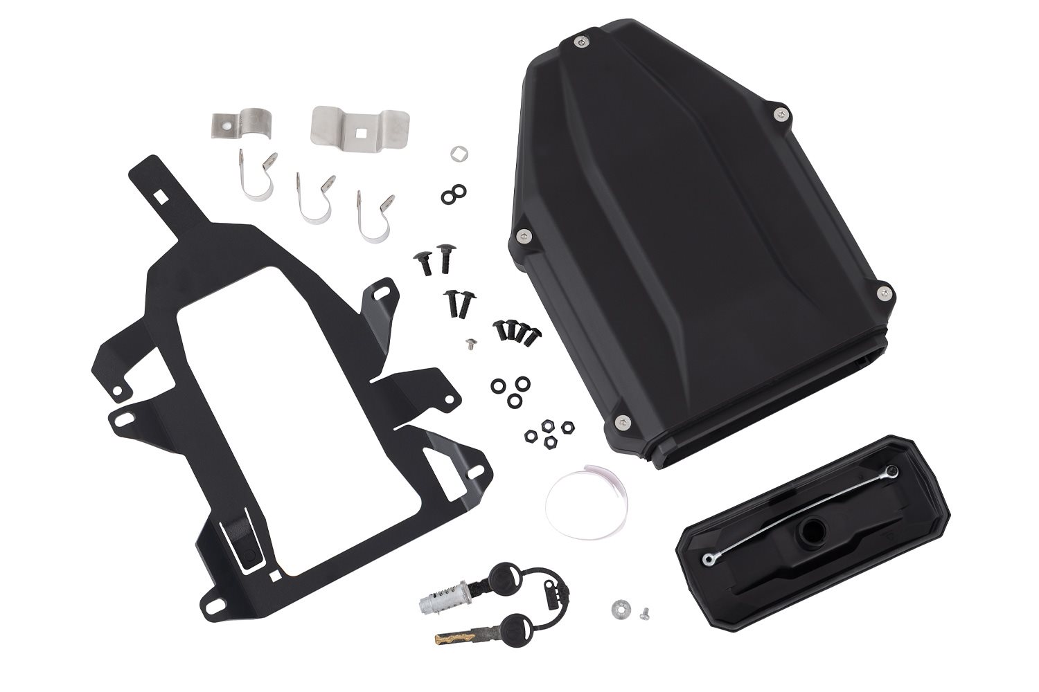 Unsere maßgeschneiderte Werkzeugbox bietet zusätzlichen Stauraum für allerlei hilfreiche Kleinigkeiten und integriert sich dafür perfekt in die Nische zwischen dem linken Kofferträger und dem Hinterrad. Die funktionale, robuste Box ist mit vier soliden Gewindeeinsätzen versehen und wird mit einem Halter und passenden Schellen am Wunderlich Kofferträger sicher montiert. Für die jederzeit gute Zugänglichkeit lässt sie sich vom Heck her -auch bei montierten Koffern- öffnen und schließen. Der Deckel ist gegen Verlust gesichert. Die aus hochwertigem Kunststoff bestehende Box ist wasserdicht und extrem robust. Wir liefern sie mit dem Halter.