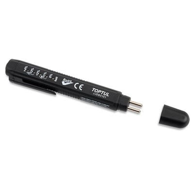 Bremsflüssigkeitstester zum Messen des Wassergehalts in der Bremsflüssigkeit. Der Bremsflüssigkeitstester von TOPTUL sollte in keiner Werkstatt fehlen. Da Bremsflüssigkeit hygroskopisch (wasseranziehend) ist, sollte man den Wassergehalt der Bremsflüssigkeit regelmäßig testen. Dabei hilft einem dieses leicht zu bedienende Werkzeug. Klein und handlich (L=150mm)Wassergehalt wird durch LED dargestellt Direktes Ergebnis Das Gerät besticht durch sein simples Design und seine Handlichkeit. Durch die 5 LED-Lampen lässt sich der Wassergehalt der Bremsflüssigkeit sehr leicht ablesen und man kann direkt sehen, ob es nötig ist seine Bremsflüssigkeit zu tauschen. Technische Daten: Misst den prozentualen Wassergehalt von Bremsflüssigkeit (DOT 4) 5 LED-Leuchten zeigen den prozentualen Wassergehalt in der Bremsflüssigkeit Kann bei diversen Fahrzeugen verwendet werden (Roller, Motorrad, Auto, oder LKW) LED-Anzeige: Grün: OK, kein Wasser in der Bremsflüssigkeit. Grün/Gelb: Weniger als 1% Wasser in der Bremsflüssigkeit. Grün/Gelb/Gelb: Ca. 2% Wasser in der Bremsflüssigkeit. Grün/Gelb/Gelb/Rot: Ca. 3% Wasser in der Bremsflüssigkeit. Die Bremsflüssigkeit sollte getauscht werden.Grün/Gelb/Gelb/Rot/Rot: Mindestens 4% Wasser in der Bremsflüssigkeit. Die Bremsflüssigkeit sollte umgehend getauscht werden. Fazit: Der Bremsflüssigkeitstester sollte in keiner Werkstatt oder Garage fehlen. Durch ihn lässt sich direkt die Gefahr eines zu hohen Wassergehalts in der Bremsflüssigkeit feststellen. Kaufempfehlung unser SIP TIPP: Bei Bedarf gleich eine neue Bremsflüssigkeit und passendes Werkzeug für den Wechsel mitbestellen originale Bremsleitung durch Stahlflexleitung ersetzten