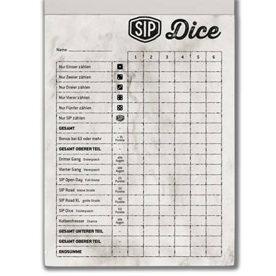 Der Würfelspiel SIP Dice Gewinnblatt Block (Ersatzblock) ist im praktischen Format DIN A6 gehalten. Die Benennungen sind Vespa Fahrern sicher geläufig und erhöhen den Spielspass für jung und alt. Deutsch und Englisch (Vorder- und Rückseite). Benötigt das Würfelspiel SIP Dice. Spartip: 5 Stück Vorratspackung erhältlich. Made in Germany.