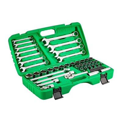 Steckschlüsselsatz in qualitativ hochwertiger Ausführung. Der Steckschlüsselsatz von TOPTUL sollte in keiner Werkstatt fehlen. Durch seine hohe Fertigungsqualität ist er auch für den anspruchsvollen täglichen Gebrauch geeignet. Hohe Fertigungsgüte Große Auswahl an verschieden Nüssen und Ringmaulschlüssel Stabile Verpackungsbox Der Steckschlüsselsatz wird in einer matten Chrom Ausführung geliefert und bietet ein umfangreiches Sortiment. Highlights im Überblick:Matte Chrom Ausführung Umfangreiche Ausstattung Stabile Aufbewahrungsbox aus ABS-Kunststoff Ratsche mit 36 Zähnen und einer Schnellentriegelung Fazit: Ein Steckschlüsselsatz mit einer umfangreichen Ausstattung zu einem sehr guten Preis/Leistungsverhältnis. Kaufempfehlung unser SIP TIPP:Direkt mit weiterem Werkzeug von TOPTUL kombinieren. Eine Werkzeugtasche für die Aufbewahrung wäre eine gute Ergänzung. Inhalt: Ringmaulschlüssel: 8, 9, 10, 11, 12, 13, 14, 17, 19, 21, 22 mm1/2“ Stecknüsse: 8, 9, 10, 11, 12, 13, 14, 15, 16, 17, 18, 19, 20, 21, 22, 23, 24, 25, 26, 27, 28, 29, 30, 32 mm1/2“ Verlängerung: kurz (5“Länge) und lang (10“Länge) 1/2“ Gelenkstück 1/2“ Ratsche, verstellbar und mit 36 Zähnen 1/2“ Zündkerzenstecknuss: 16 und 21 mm 1/2" T-Gleitgriff (10"Länge)