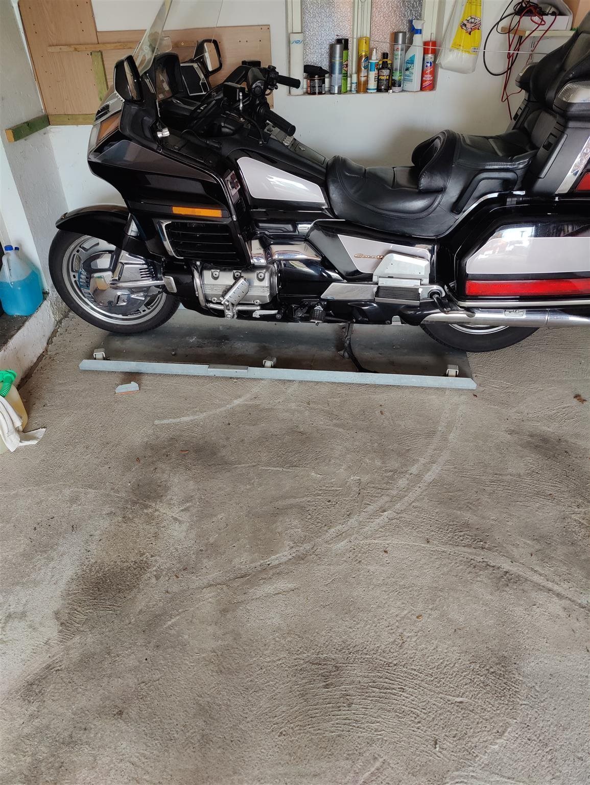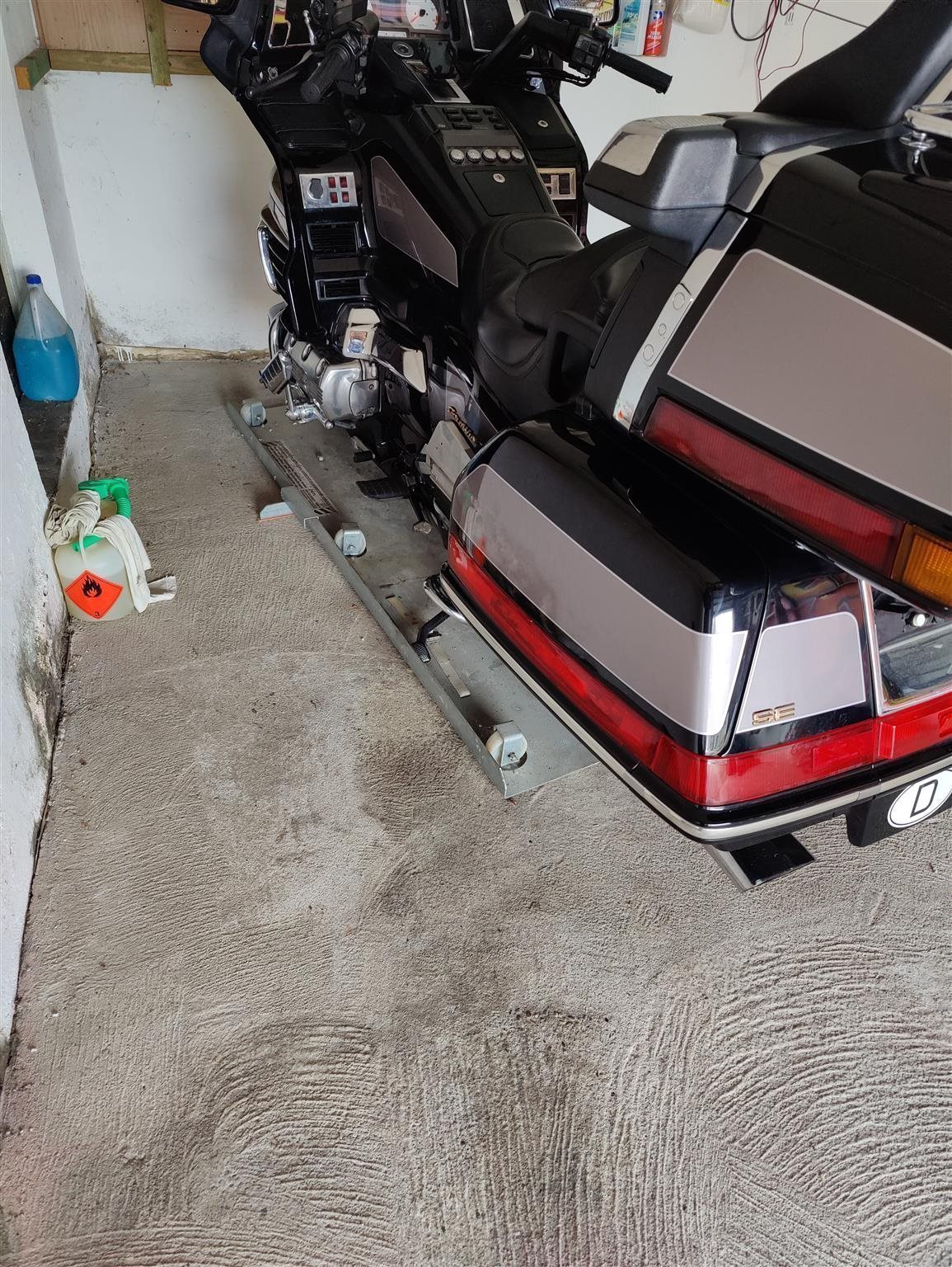 Schwenkbare Plattform aus verzinktem Stahlblech für Maschienen bis 450 kg . Damit kann man sehr einfach das Motorrad in der Garage quer an die Rückwand schieben.