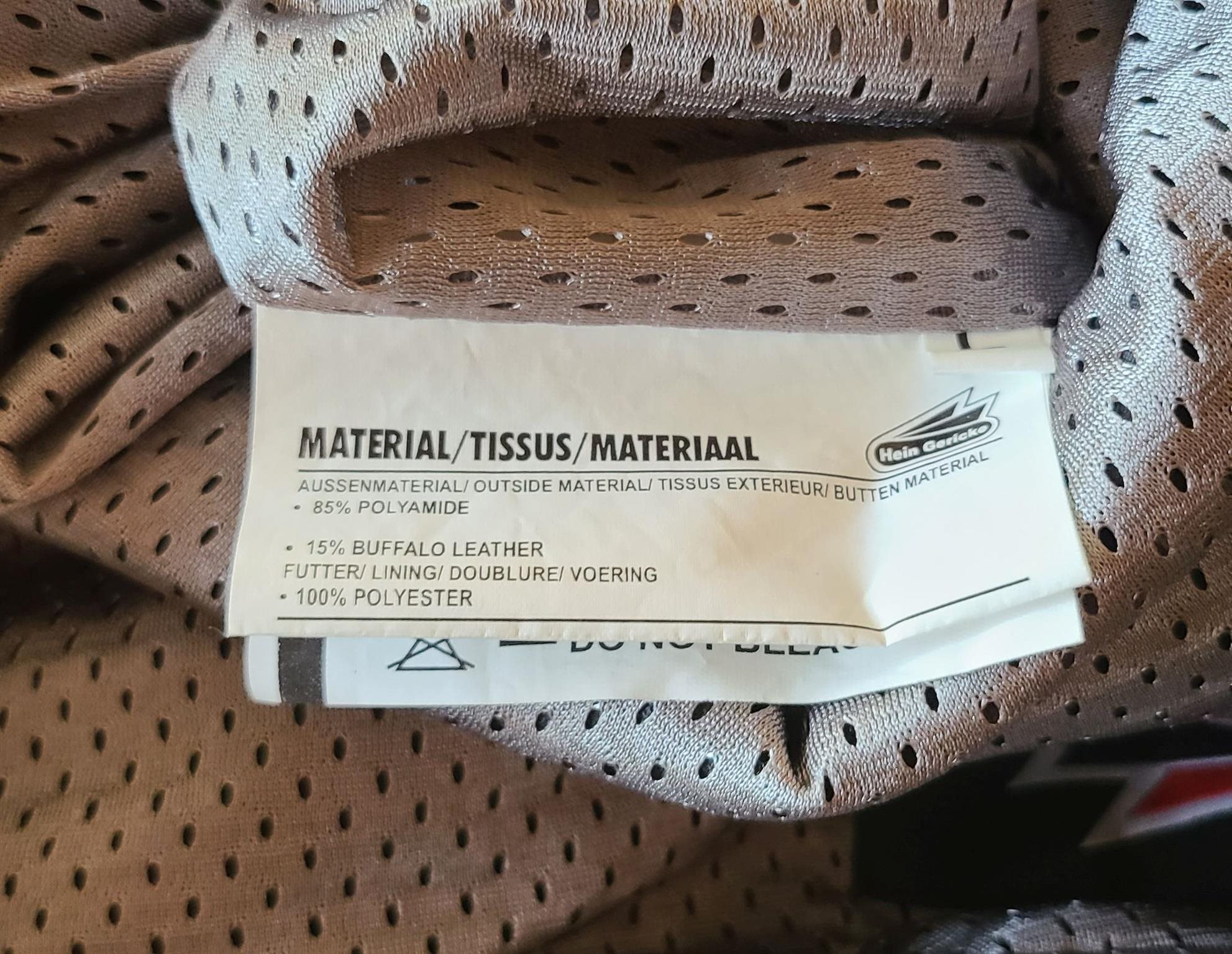 Hose aus 85 % Polyamid und 15 % Büffelleder. Das Leder hat eine wildlederartige Oberfläche.