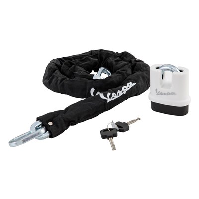 Original Piaggio Vespa Sicherheitsschloss. Die Kette ist aus speziell gehärtetem Stahl, mit 10 mm starken Kettengliedern. Die schwarze Ummantelung mit Vespa Schriftzug dient zum Schutz der Stahlkette. Das Schloss besitzt einen Wendeschlüssel. Erhältlich ist es in zwei verschiedenen Längen: Länge 110cm = Gewicht ca. 2,61kg Länge 140cm = Gewicht ca. 3,20kg