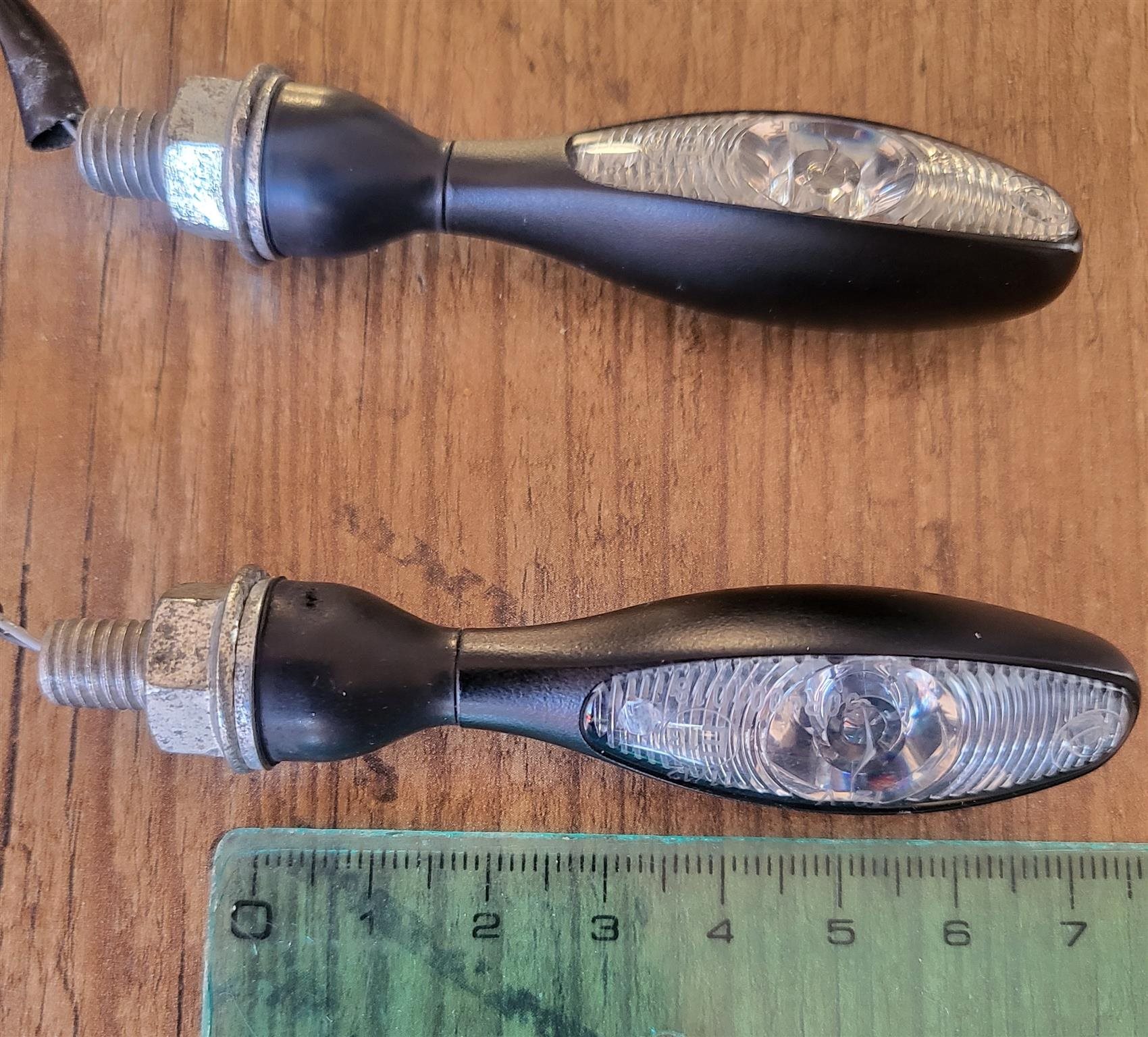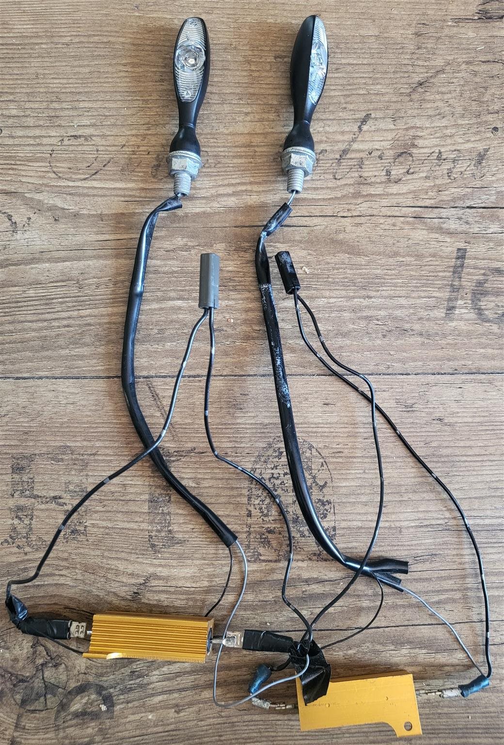 2 Stk. LED-Mini-Blinker in Schwarz, Metallgehäuse, Länge ca. 7 cm, Stecker passend für Suzuki GSX-R 1000, inkl. notwendiger Widerstände und Verkabelung, Versand gegen Aufpreis möglich, 25,- €