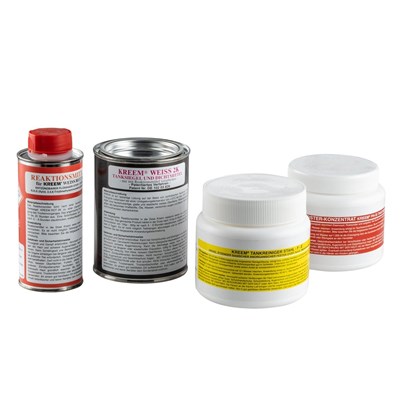 KREEM WEISS 2K Set 1W für Tanks je 12 Liter - Das einzige patentierte Tankversiegelungssystem auf dem Markt. Bewährt seit 1985. Das Standardprodukt für den versierten Oldtimer-Restaurierer. Mit diesem Set kannst Du Tanks je 12 Liter reinigen, entrosten und versiegeln. 4 verschiedene Reinigungs- und Konservierungsstufen ergeben ein herausragendes Ergebnis. Dein Set besteht aus je 1x: - Kreem Tankreiniger Stahl F-E - Kreem 2K Tankentroster PH-SI - Kreem 2K Tanksiegel_D - Kreem 2K Reaktionsmittel_D - Detaillierte Gebrauchsanleitung Bitte beachte folgende Sicherheits- und Gefahrenhinweise. 1) Kreem Tankreiniger Stahl F-E SignalwortGefahr Gefahrbestimmende Komponenten zur EtikettierungNatriumhydroxid Dinatriummetasilikat Reaktionsprodukt aus Benzolsulfonsäure, 4-C10-13-sekundäre Alkylderivate und Benzolsulfonsäure, 4-methyl- und Natriumhydroxid GefahrenhinweiseH290 Kann gegenüber Metallen korrosiv sein. H314 Verursacht schwere Verätzungen der Haut und schwere Augenschäden. SicherheitshinweiseP260 Staub oder Nebel nicht einatmen.P303+P361+P353BEI BERÜHRUNG MIT DER HAUT (oder dem Haar): Alle kontaminierten Kleidungsstücke sofort ausziehen. Haut mit Wasser abwaschen [oder duschen]. P305+P351+P338BEI KONTAKT MIT DEN AUGEN: Einige Minuten lang behutsam mit Wasser spülen. Eventuell vorhandene Kontaktlinsen nach Möglichkeit entfernen. Weiter spülen. P310 Sofort GIFTINFORMATIONSZENTRUM/Arzt anrufen. P321 Besondere Behandlung (siehe auf diesem Kennzeichnungsetikett). P501 Entsorgung des Inhalts / des Behälters gemäß den örtlichen / regionalen / nationalen/ internationalen Vorschriften. Sonstige Gefahren Ergebnisse der PBT- und vPvB-Beurteilung Gemäß Anhang XIV der Verordnung (EG) Nr. 1907/2006 zur Registrierung, Bewertung, Zulassung und Beschränkung chemischer Stoffe (REACH): Das Produkt enthält keinen Stoff, der die PBTKriterien (persistent/bioakkumulativ/toxisch) oder die vPvB-Kriterien (sehr persistent/sehr bioakkumulativ) erfüllt. Selbsteinstufung. PBT: Nicht anwendbar. vPvB: Nicht anwendbar. 2) Kreem 2K Tankentroster PH-SI SignalwortGefahr Gefahrenhinweise H302+H312 Gesundheitsschädlich bei Verschlucken oder Hautkontakt. H318 Verursacht schwere Augenschäden. SicherheitshinweiseP280 Schutzhandschuhe/Schutzkleidung/Augenschutz/Gesichtsschutz tragen. P301+P312 BEI VERSCHLUCKEN: Bei Unwohlsein GIFTINFORMATIONSZENTRUM/Arzt anrufen. P302+P352 BEI BERÜHRUNG MIT DER HAUT: Mit viel Wasser und Seife waschen. P305+P351+P338 BEI KONTAKT MIT DEN AUGEN: Einige Minuten lang behutsam mit Wasser spülen. Eventuell vorhandene Kontaktlinsen nach Möglichkeit entfernen. Weiter spülen. P310 Sofort GIFTINFORMATIONSZENTRUM/Arzt anrufen Sonstige GefahrenStaubexplosionsgefahr. Ergebnisse der PBT- und vPvB-Beurteilung: Nach den Ergebnissen seiner Bewertung ist dieser Stoff weder ein PBT- noch ein vPvB-Stoff. 3) Kreem 2K Tanksiegel_D Signalwort Achtung Gefahrbestimmende Komponenten zur EtikettierungBisphenol-A-Epichlorhydrinharze mit durchschnittlichem Molekulargewicht 700-1100 Xylol Gefahrenhinweise H226 Flüssigkeit und Dampf entzündbar. H315 Verursacht Hautreizungen. H317 Kann allergische Hautreaktionen verursachen. H319 Verursacht schwere Augenreizung. H373 Kann die Organe schädigen bei längerer oder wiederholter Exposition. H411 Giftig für Wasserorganismen, mit langfristiger Wirkung. Sicherheitshinweise P101 Ist ärztlicher Rat erforderlich, Verpackung oder Kennzeichnungsetikett bereithalten. P102 Darf nicht in die Hände von Kindern gelangen. P103 Vor Gebrauch Kennzeichnungsetikett lesen. P210 Von Hitze, heißen Oberflächen, Funken, offenen Flammen und anderen Zündquellen fernhalten. Nicht rauchen. P260 Staub/Rauch/Gas/Nebel/Dampf/Aerosol nicht einatmen. P280 Schutzhandschuhe/Schutzkleidung/Augenschutz/Gesichtsschutz tragen. P303+P361+P353 BEI BERÜHRUNG MIT DER HAUT (oder dem Haar): Alle kontaminierten Kleidungsstücke sofort ausziehen. Haut mit Wasser abwaschen [oder duschen]. P305+P351+P338 BEI KONTAKT MIT DEN AUGEN: Einige Minuten lang behutsam mit Wasser spülen. Eventuell vorhandene Kontaktlinsen nach Möglichkeit entfernen. Weiter spülen. P501 Entsorgung des Inhalts / des Behälters gemäß den örtlichen / regionalen / nationalen/ internationalen Vorschriften. Zusätzliche Angaben EUH205 Enthält epoxidhaltige Verbindungen. Kann allergische Reaktionen hervorrufen. Sonstige Gefahren Ergebnisse der PBT- und vPvB-Beurteilung PBT: Nicht anwendbar. vPvB: Nicht anwendbar. 4) Kreem 2K Reaktionsmittel_D Signalwort Achtung Gefahrbestimmende Komponenten zur EtikettierungXylol 1-Methoxy-2-propanol n-Butylacetat Gefahrenhinweise H226 Flüssigkeit und Dampf entzündbar. H315 Verursacht Hautreizungen. H319 Verursacht schwere Augenreizung. H336 Kann Schläfrigkeit und Benommenheit verursachen. H373 Kann die Organe schädigen bei längerer oder wiederholter Exposition. Sicherheitshinweise P101 Ist ärztlicher Rat erforderlich, Verpackung oder Kennzeichnungsetikett bereithalten. P102 Darf nicht in die Hände von Kindern gelangen. P103 Vor Gebrauch Kennzeichnungsetikett lesen. P210 Von Hitze, heißen Oberflächen, Funken, offenen Flammen und anderen Zündquellen fernhalten. Nicht rauchen. P260 Staub/Rauch/Gas/Nebel/Dampf/Aerosol nicht einatmen. P280 Schutzhandschuhe/Schutzkleidung/Augenschutz/Gesichtsschutz tragen. P303+P361+P353 BEI BERÜHRUNG MIT DER HAUT (oder dem Haar): Alle kontaminierten Kleidungsstücke sofort ausziehen. Haut mit Wasser abwaschen [oder duschen]. P305+P351+P338 BEI KONTAKT MIT DEN AUGEN: Einige Minuten lang behutsam mit Wasser spülen. Eventuell vorhandene Kontaktlinsen nach Möglichkeit entfernen. Weiter spülen. P501 Entsorgung des Inhalts / des Behälters gemäß den örtlichen / regionalen / nationalen/ internationalen Vorschriften. Sonstige Gefahren Ergebnisse der PBT- und vPvB-Beurteilung PBT: Nicht anwendbar. vPvB: Nicht anwendbar.
