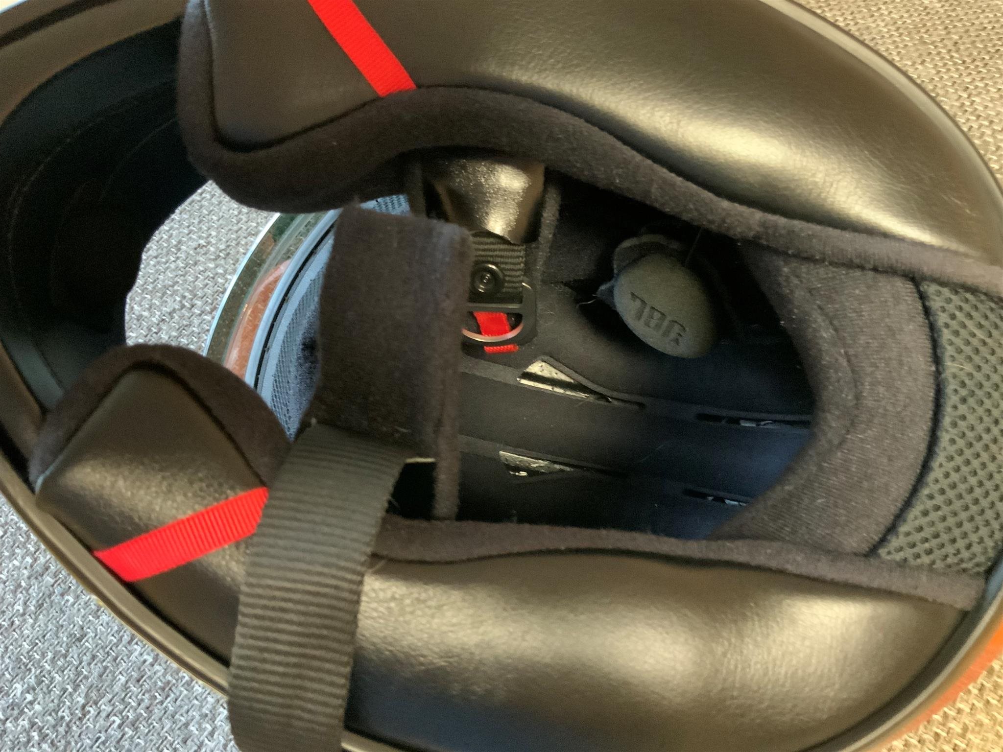 Doppel-ring-Verschluss. Einfach zu bedienen und immer eine perfekte Passform. Es gibt noch ein extra Kopfpolster und original Helmbeutel dazu. Auch um Umfang dabei ein helles Visier und ein getöntes in der Farbe Dark Smoke.