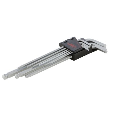 Inbusschlüsselsatzmit Kugelkopfim praktischen Klapphalterverkürzte Schenkel für geringen Platz oberhalb der Verschraubung einem extralangen Schenkel für höchste DrehmomenteInhalt: je 1x 1,5, 2,0, 2,5, 3,0, 4,0, 5,0, 6,0, 8,0, 10,0mm