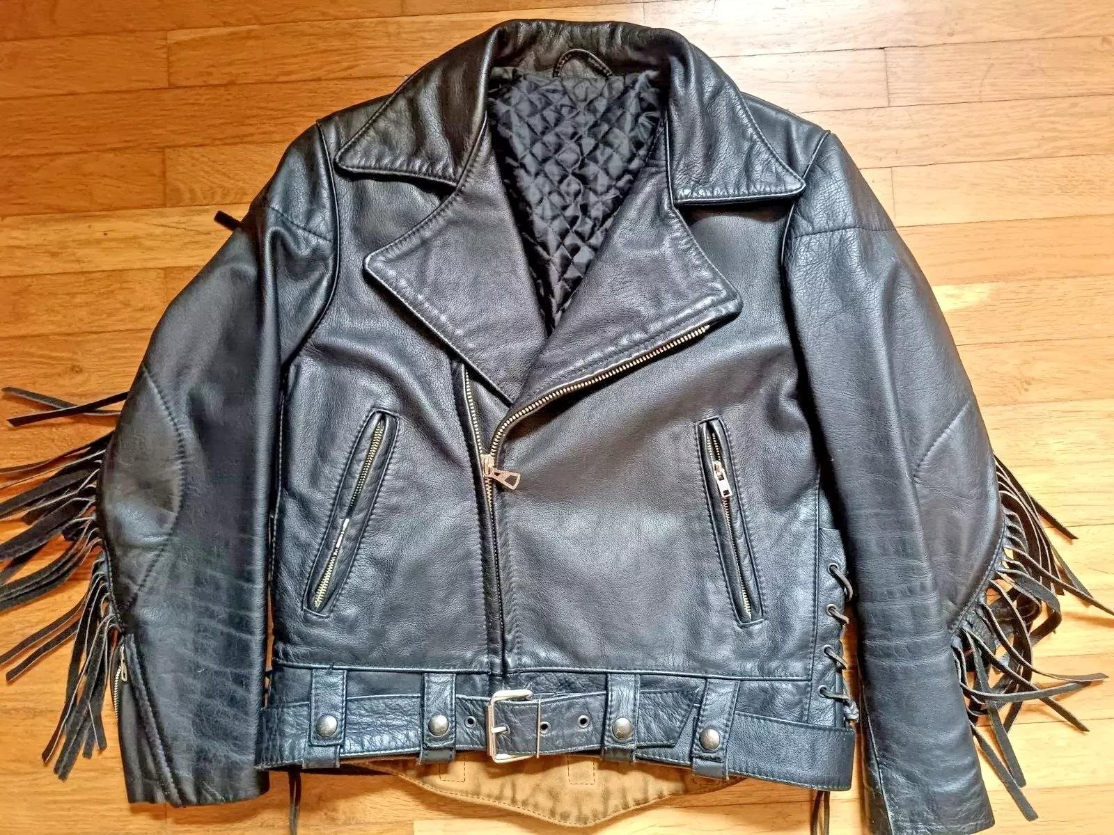 Schicker 2-teiliger Lederanzug für eine zierliche Bikerin in Vintage-Look mit Schnürung u. Fransen.