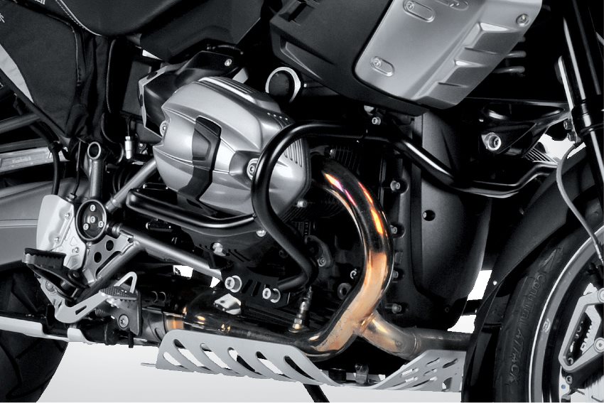 Die Schutzbügel bilden mit den BMW R 1200 GS Zylindern und Krümmern eine homogene Einheit und werden dadurch nicht als Fremdkörper empfunden.