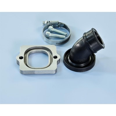 Der 360° ist ein modularer Ansaugstutzen von POLINI. Dank des zweigeteilten Systems aus Ansauggummi und Grundplatte, ist dieser 360° drehbar und erlaubt verschiedene Stellungen des Vergasers. Das System ist simpel: Der gewinkelte Verbindungsgummi wird in eine Nut in der Aluminiumgrundplatte gesteckt. Durch die individuelle Positionierung des Verbindungsgummis wird der Anschlusswinkel selbst bestimmt und ermöglicht die Verwendung von großen Vergasern an engen Stellen. Fixiert wird der Ansauggummi durch die Verschraubung der Grundplatte am SIP TIPP: Ansauggummi vorher in warmes Wasser einlegen. Macht den Gummi elastisch und den Einbau wesentlich einfacher.