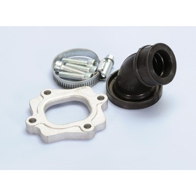 Der 360° ist ein modularer Ansaugstutzen von POLINI. Dank des zweigeteilten Systems aus Ansauggummi und Grundplatte, ist dieser 360° drehbar und erlaubt verschiedene Stellungen des Vergasers. Das System ist simpel: Der gewinkelte Verbindungsgummi wird in eine Nut in der Aluminiumgrundplatte gesteckt. Durch die individuelle Positionierung des Verbindungsgummis wird der Anschlusswinkel selbst bestimmt und ermöglicht die Verwendung von großen Vergasern an engen Stellen. Fixiert wird der Ansauggummi durch die Verschraubung der Grundplatte am SIP TIPP: Ansauggummi vorher in warmes Wasser einlegen. Macht den Gummi elastisch und den Einbau wesentlich einfacher.