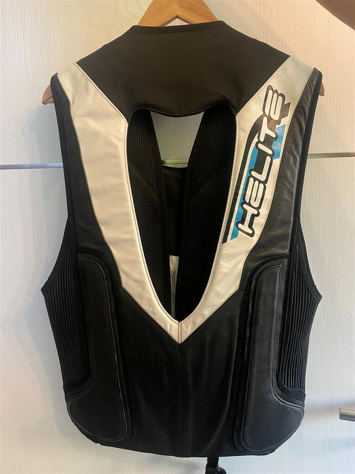 die größte Besonderheit der Helite GP-Air ist der Ausschnitt im Rückenbereich; durch diesen ist die Weste über Rennkombis mit großem Aerodynamikhöcker tragbar