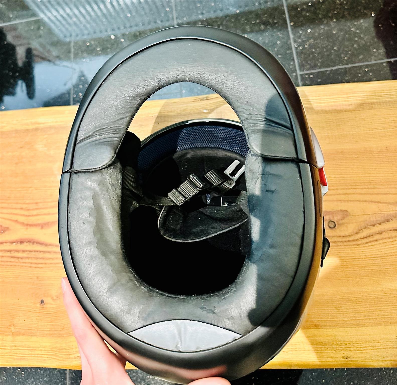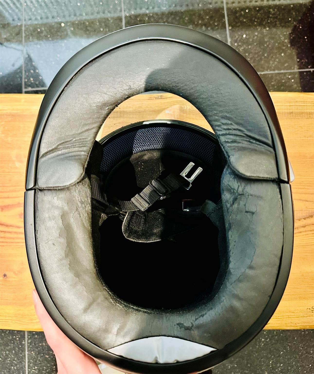 Das Innenfutter weist leichte Beschädigungen bzw. Abnutzung auf, ist jedoch weiterhin nutzbar. Optisch und funktional ist der Helm insgesamt in einem guten und gepflegten Zustand.