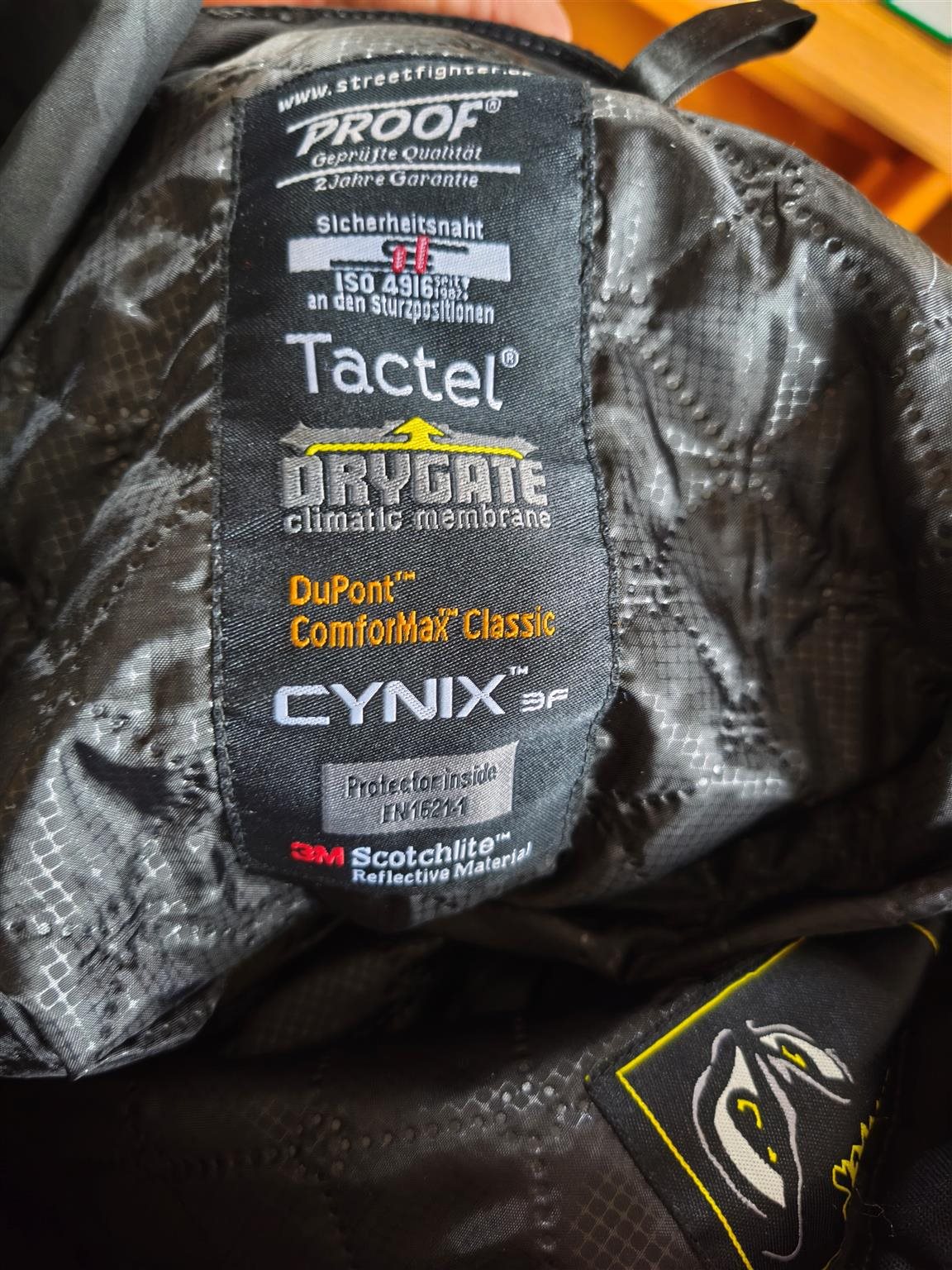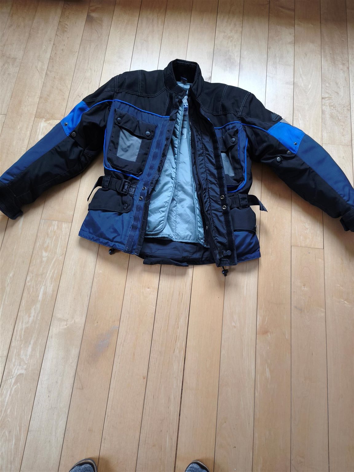 Jacke HI DRY mit Protektoren an Ellenbogen und Rücken. Hose STREETFIGHTER in Größe 36. Innenfutter herausnehmbar. Das Blau erscheint auf den Bildern heller als es ist.