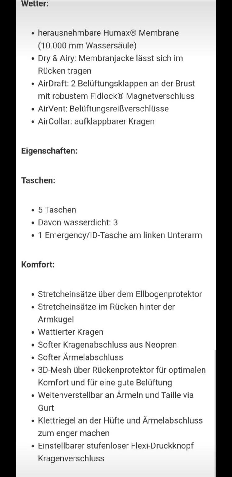 Protektoren sind außer Rücken alle vorhanden. Herausnehmbare Regen Membrane ist auch mit dabei.