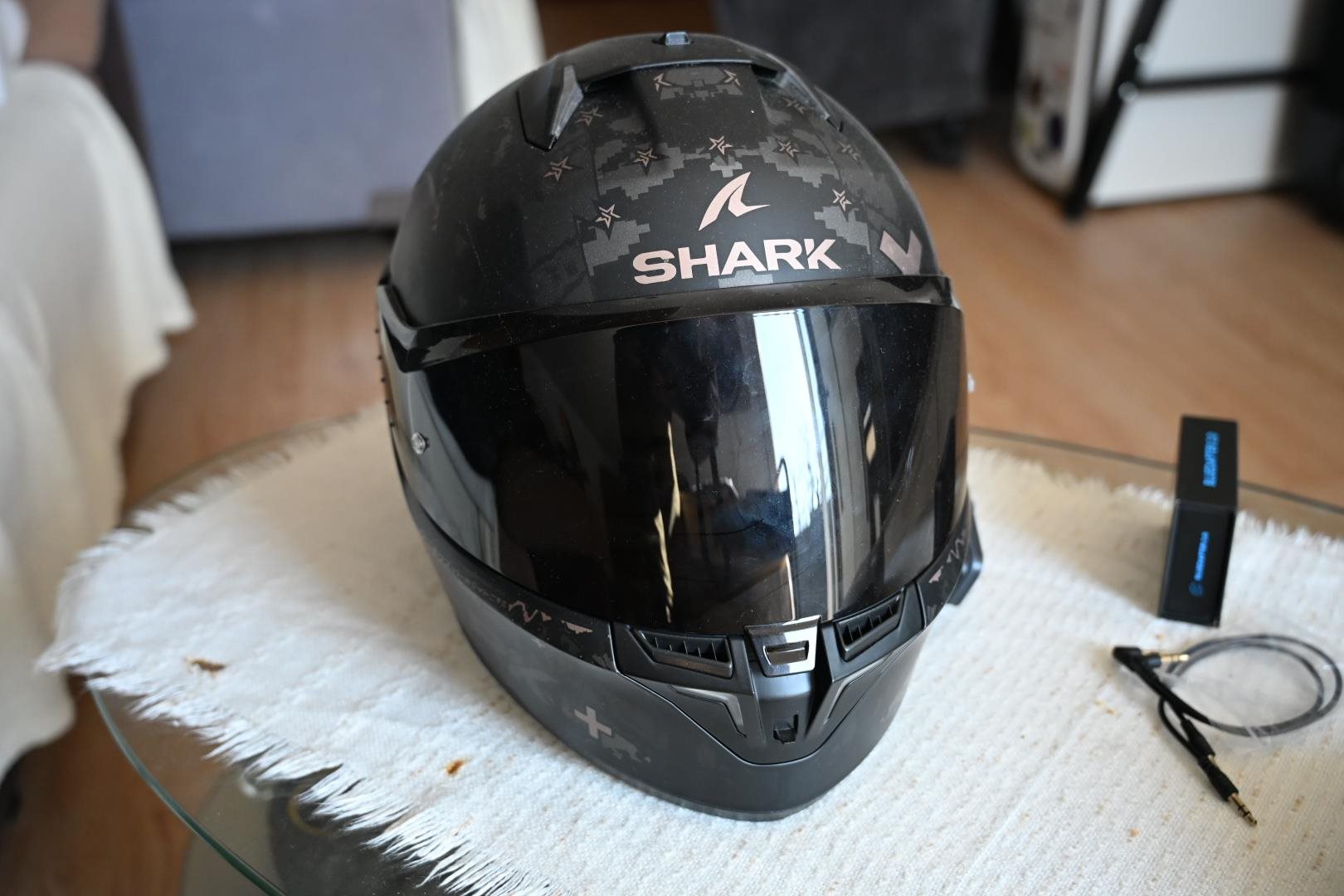 Der Helm wurde nur 1x Getragen sowie wurde das Cardo Packtalk Edge System verbaut und die Farbe der Scheibe wurde auf Schwarz geändert. Die durchsichtige Scheibe ist noch vorhanden, sowie gibt es ein Chin Adapter für Actions Cams dazu und den Blueadapter, jedoch nicht verbaut
