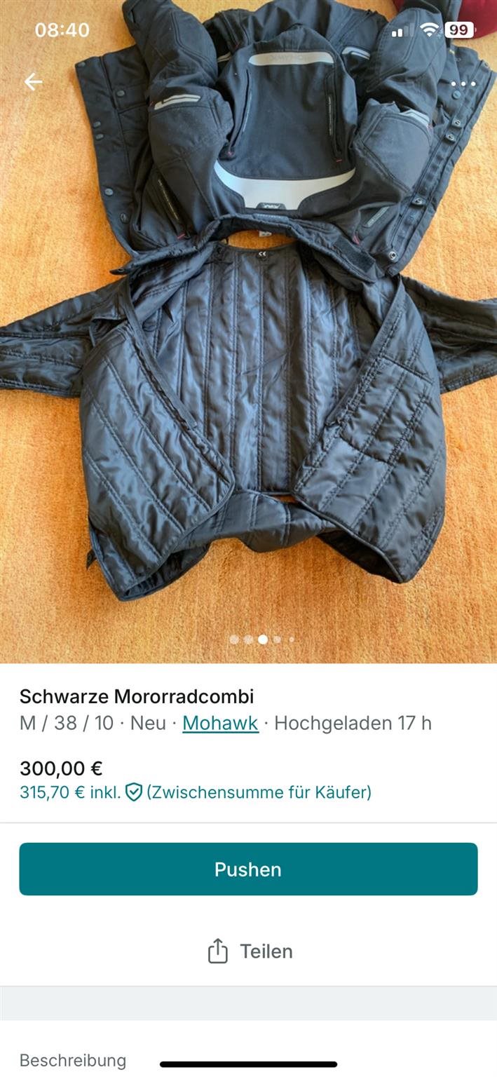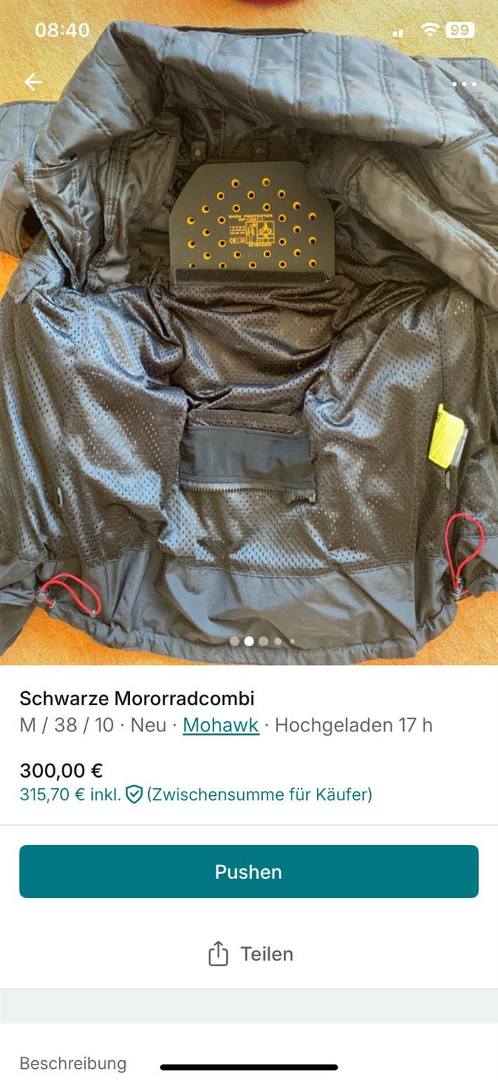 Die Jacke verfügt über einen zusätzlich gekauften Rückenprotektor, der in die Jacke eingeschoben wird, sowie Ellenbogen und Schulterprojektoren.