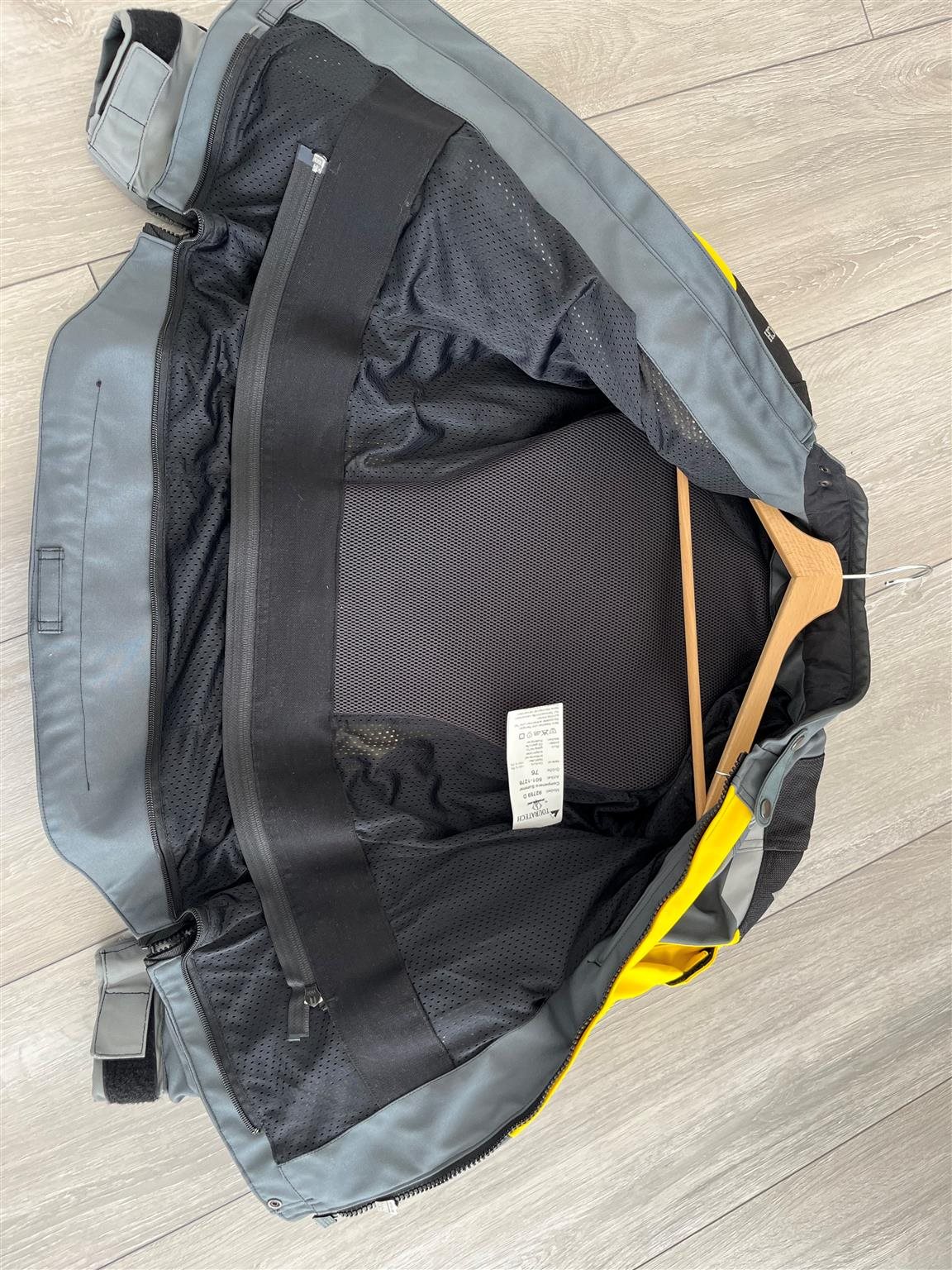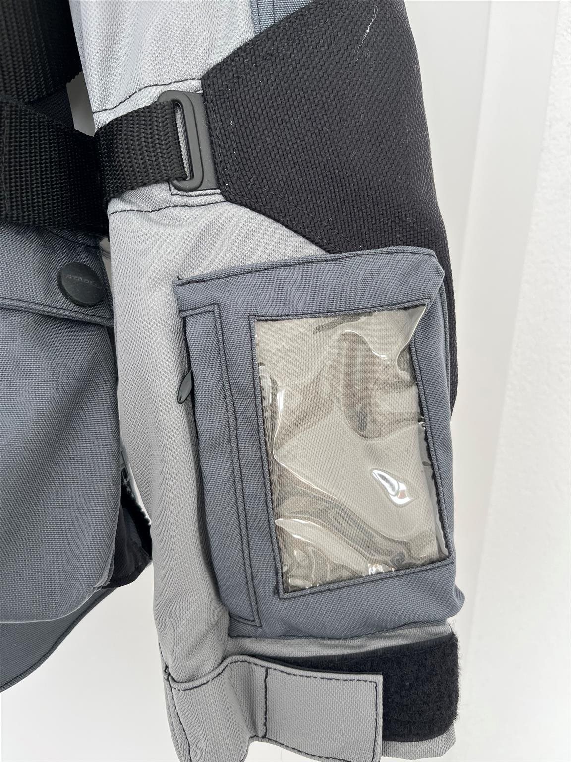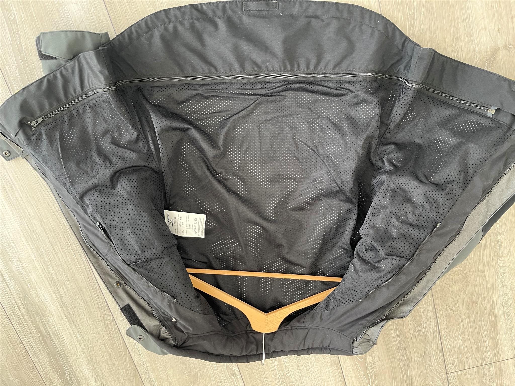 Innenjacke mit vielen weiteren Taschen, Protektoren an den Schultern und am Rücken. Hinten abnehmbare Tasche am Rücken (siehe Bild)