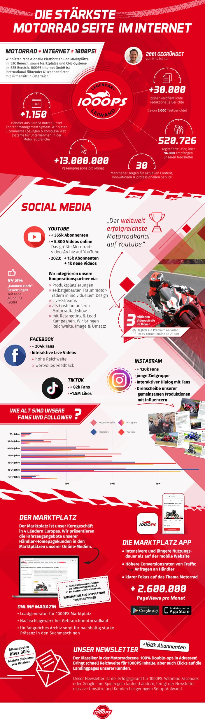 Die Motorrad Websites 1000PS.at und 1000PS.de gingen 2001 bzw. 2003 an den Start. Das Konzept wurde in den letzten Jahren immer wieder modernisiert ist aber grundsätzlich seiner Linie treu geblieben. Auf 1000PS finden interessierte Motorrad-, Roller-, und Quadfahrer/innen sowohl redaktionelle Informationen als auch Angebote im Marktplatz. Ein Forum rundet das Angebot ab.